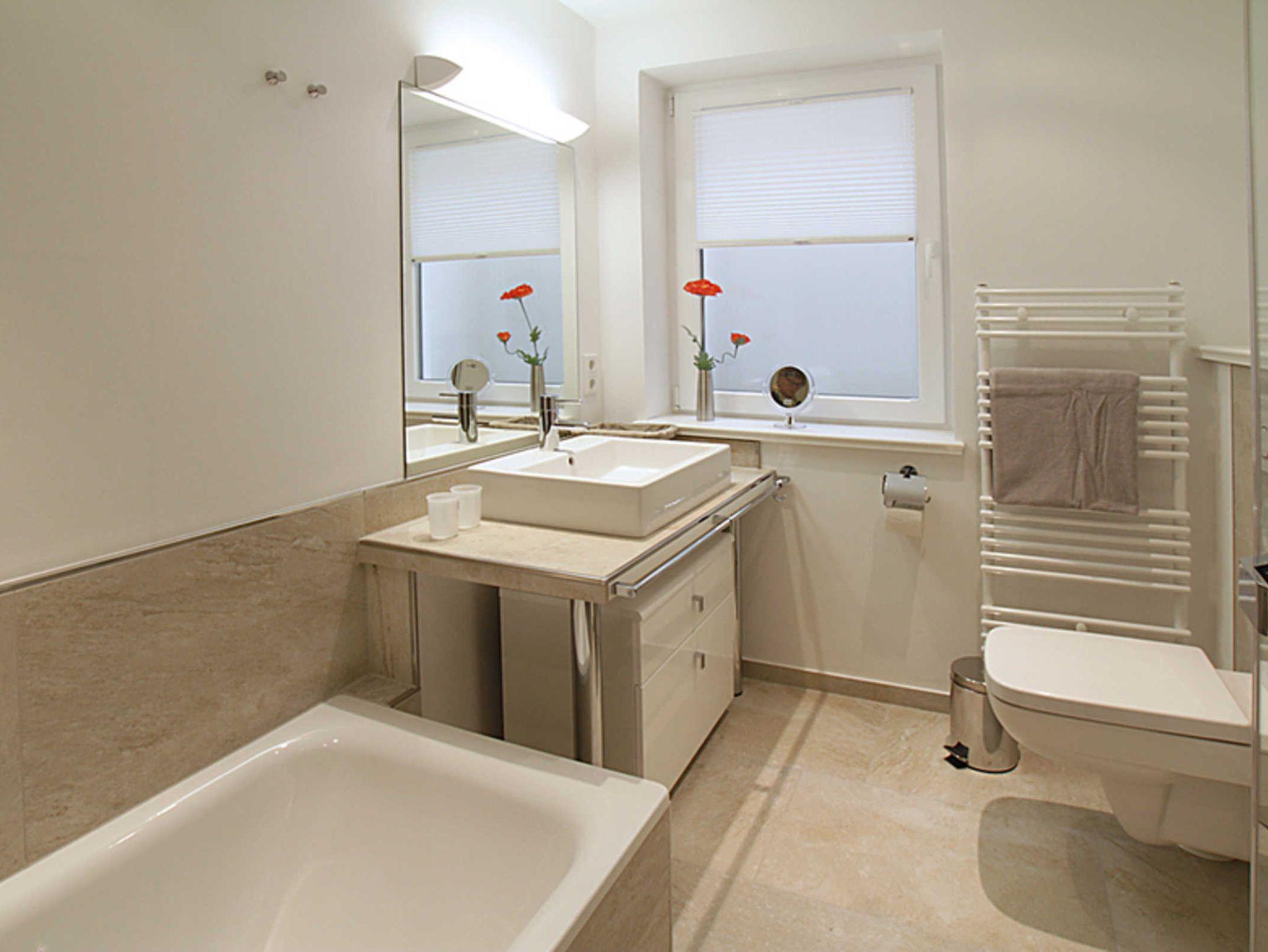 RUHIG, ZENTRAL GELEGEN und CHIC! Reihenmittelhaus mit möblierter TERRASSE nach Westen, KAMINOFEN und schöner Ausstattung. Für bis 4 Personen. Mit elegantem und gemütlichem Wohnbereich mit voller Einbauküche und Eßplatz, 2 modernen Bädern (eins mit Wanne und Dusche, eins mit Dusche) und zusätzlichem Gäste-WC. Der Kaminofen sorgt in der Herbst- und Winterzeit für heimeliges Ambiente (für Brennholz muß - wenn Kaminofennutzung gewünscht ist - selbst gesorgt werden). Das Haus hat einen separaten Eingang und verfügt über einen Parkplatz vor dem Haus. Vom Haus aus können Sie das Ortszentrum (Friedrichstrasse) in ca. 10 Minuten und den Strand in ca. 15 Minuten zu Fuß erreichen (zum Strand sind es ca. 1,2 km). 56 qm Wohnfläche.