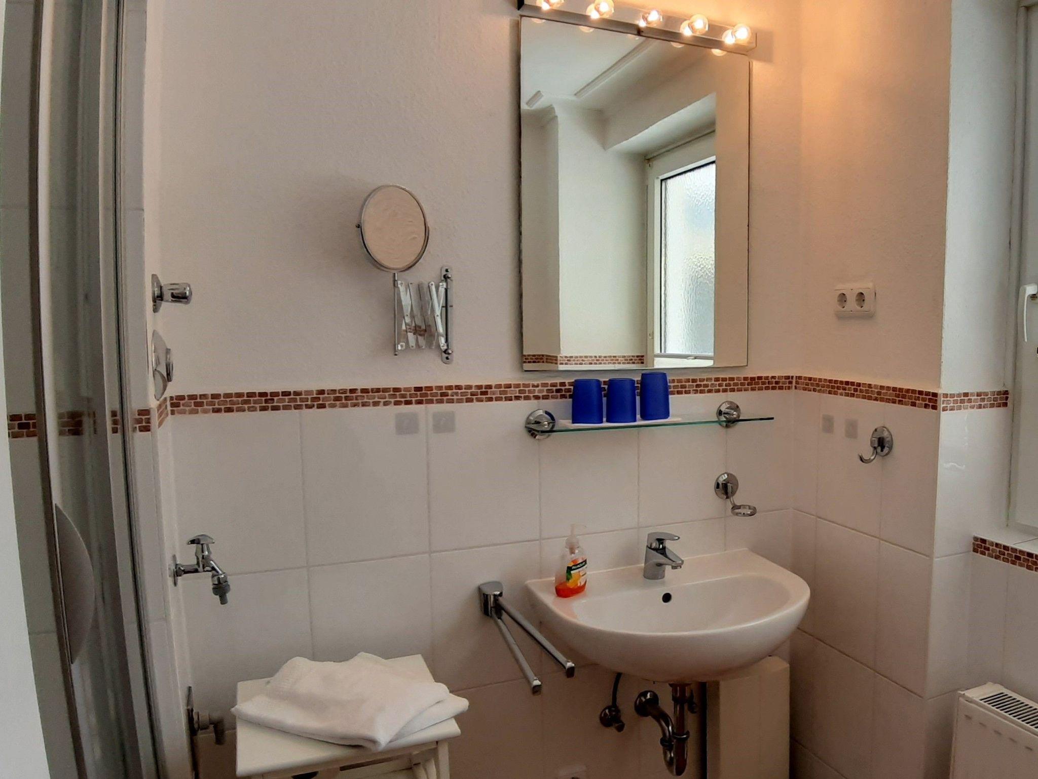 Ein helles Bad mit Waschbecken, Runddusche, WC und Außenfenster.