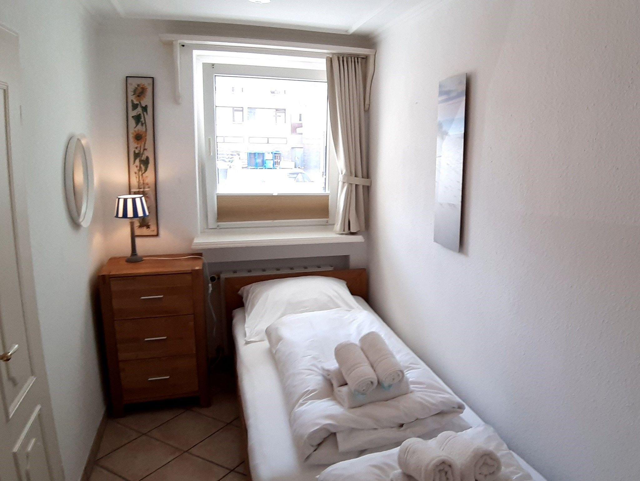 Das Schlafzimmer dient mit zwei hintereinanderstehenden Betten (90x190cm) und einer kleinen Kommode zu Ihrem allgemeinen Wohlbefinden. Bettwäsche und Handtücher sind im Endpreis enthalten.