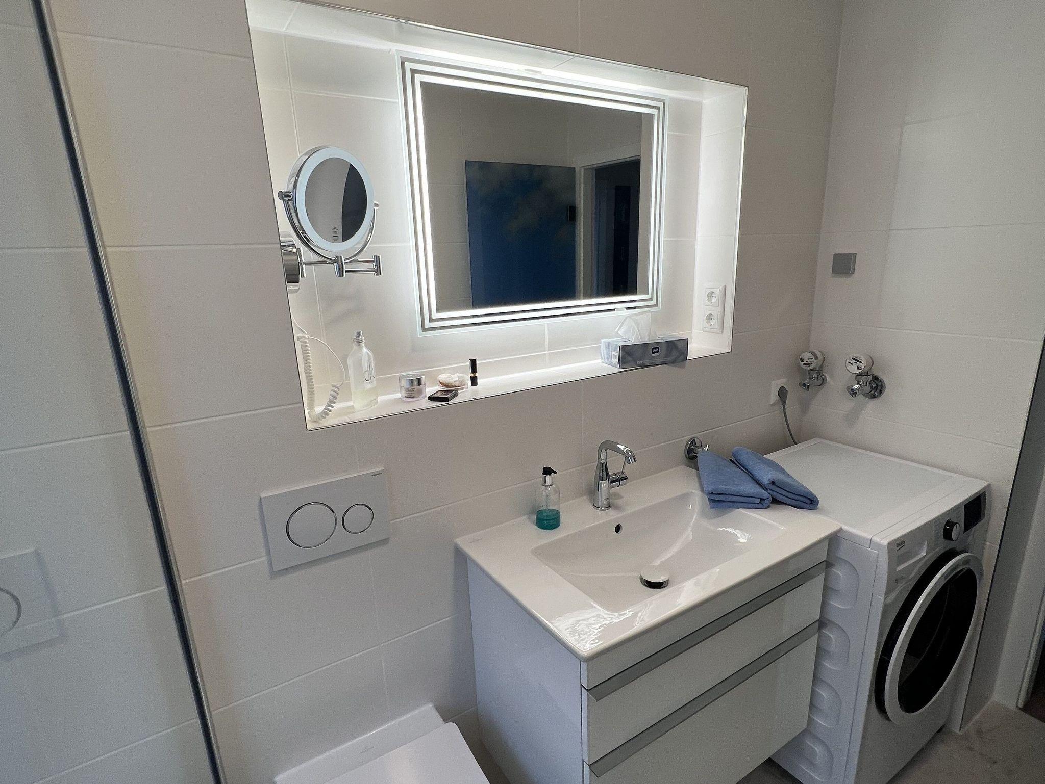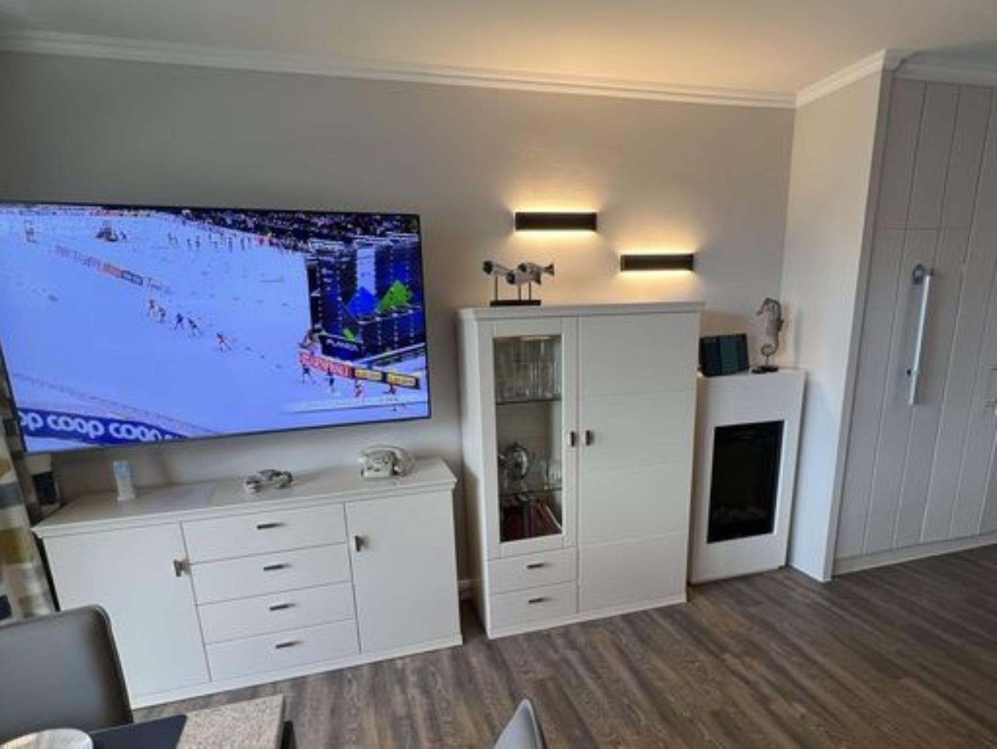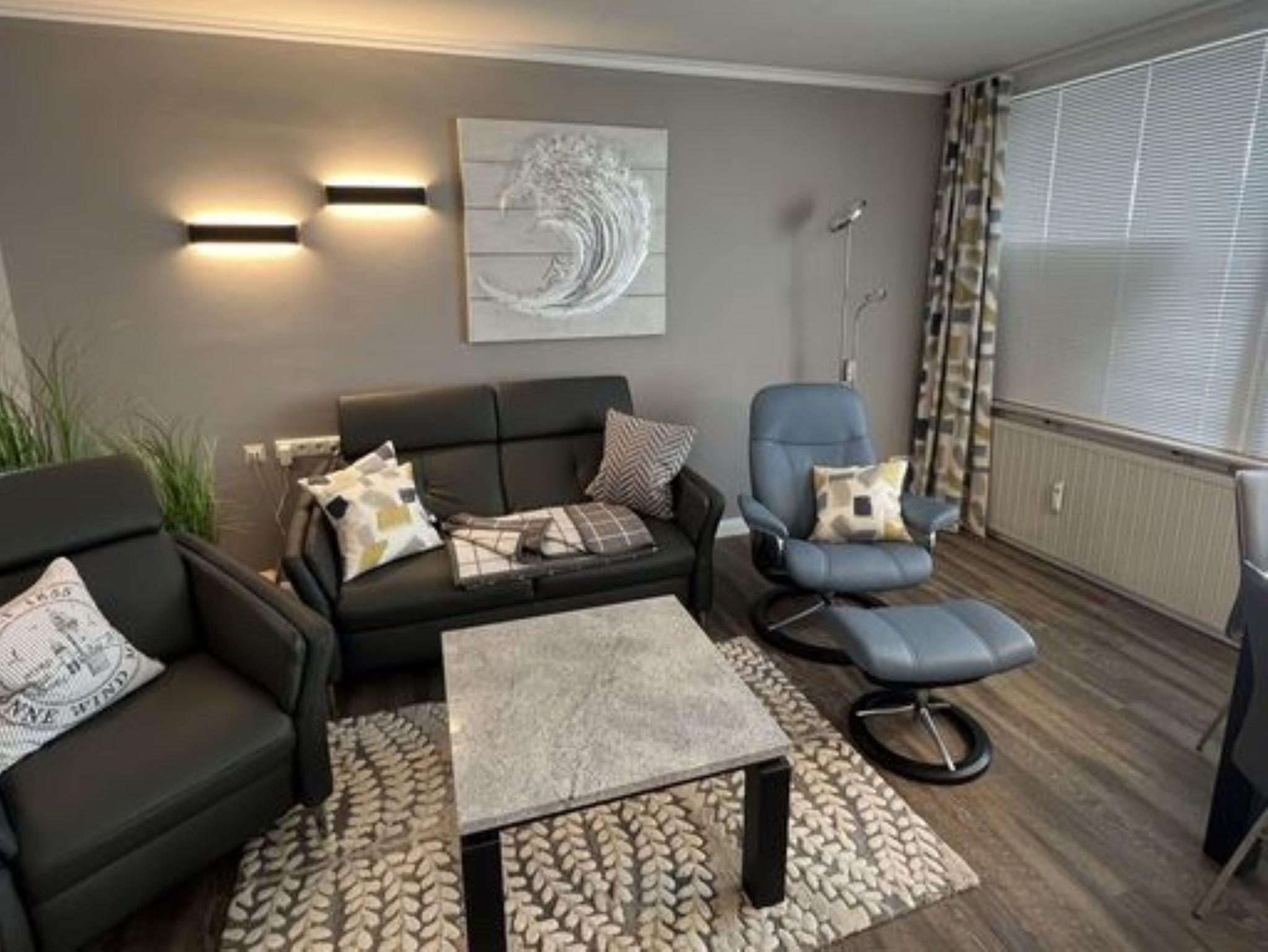Sie wohnen in einem Wohnzimmer mit offener Küche. Das Wohnzimmer hat eine gemütliche 2-er Ledercouch und einen Sessel. Zum bequemen fernsehen gibt es einen 65“ Monitor, wahlweise