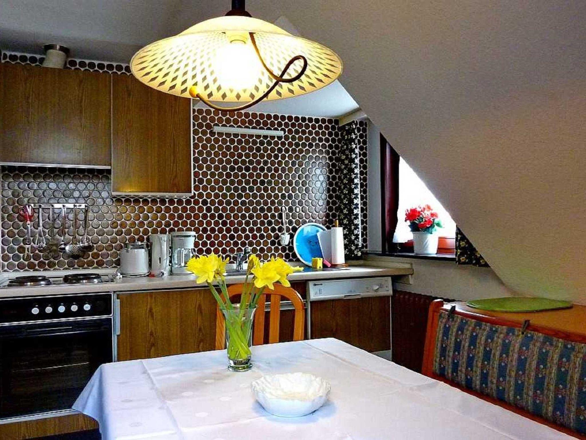 Die separate Küche ist ausgestattet mit 4-Plattencerankochfeld, Backofen, Spülmaschine, Kühlschrank, Kaffeemaschine, Wasserkocher, Toaster, Geschirr für den täglichen Gebrauch und einem Essbereich mit Eckbank.