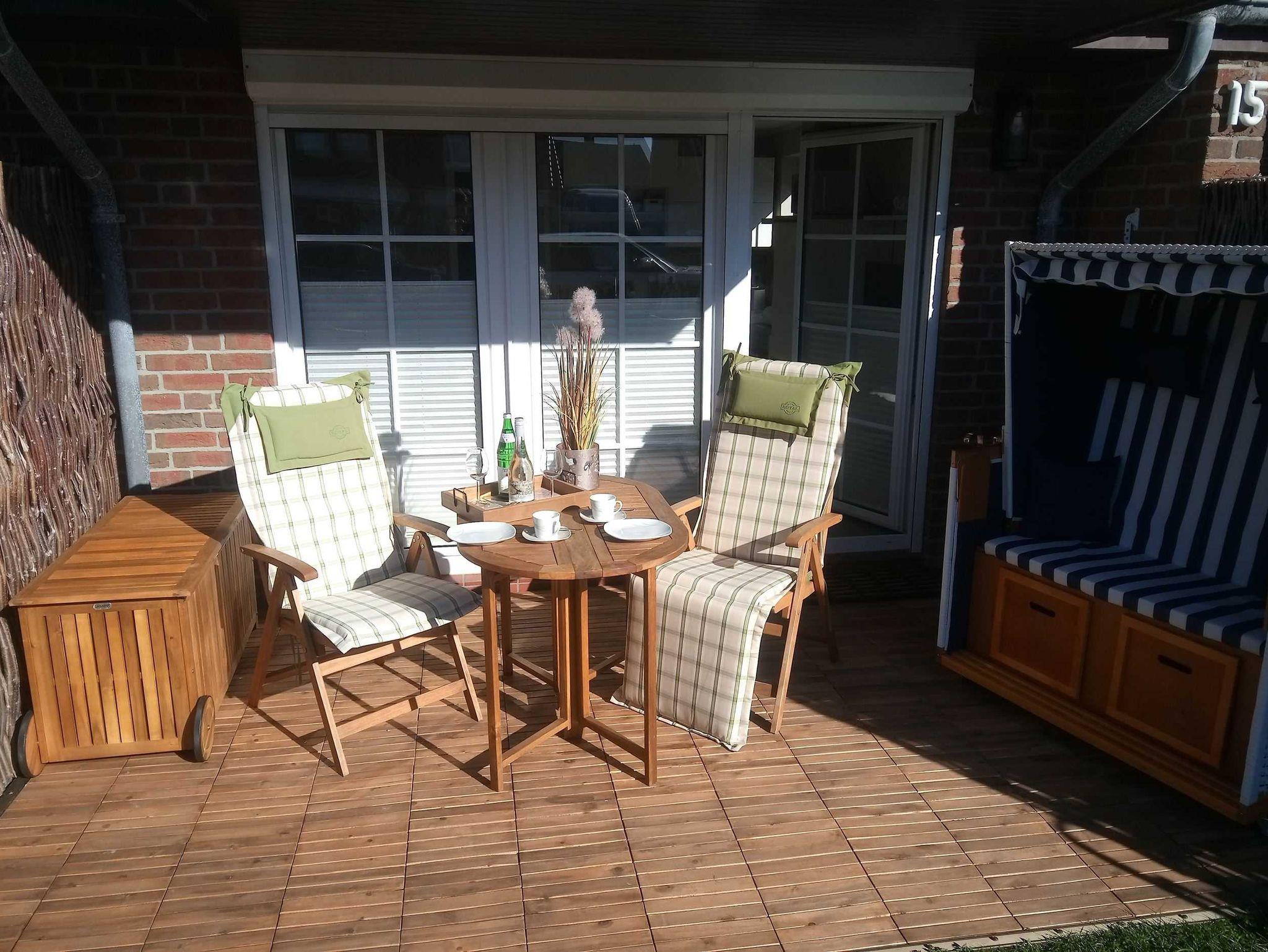 Eine sonnige windgeschützte Terrasse mit Sitzgelegenheit, ein eigener Parkplatz