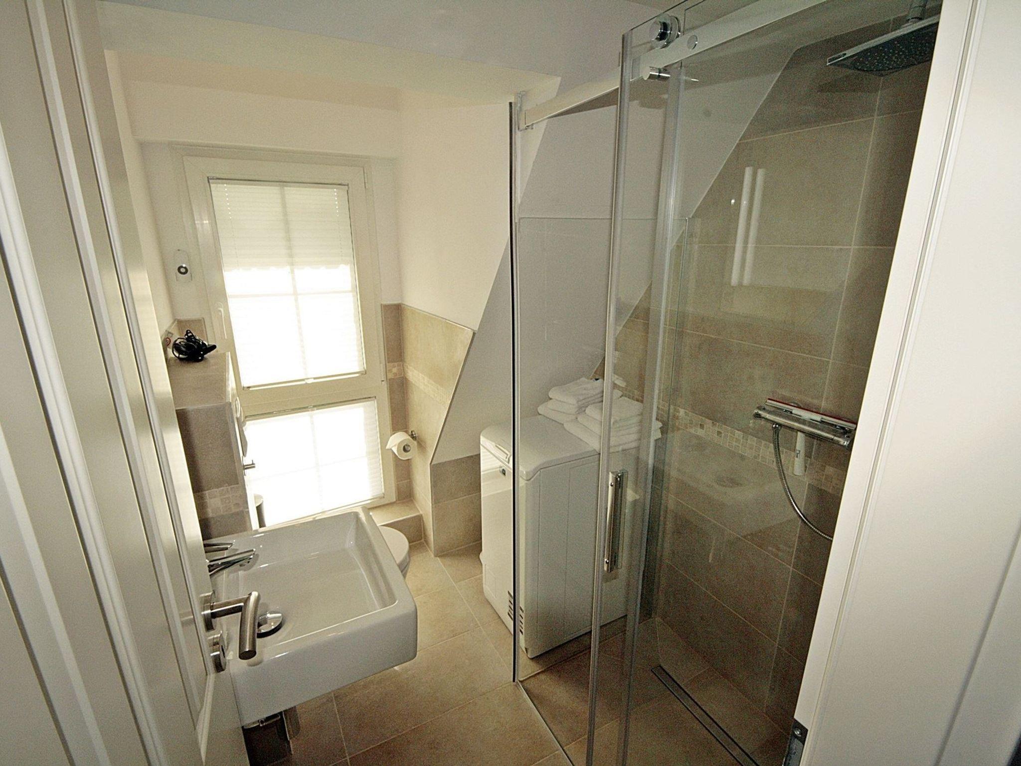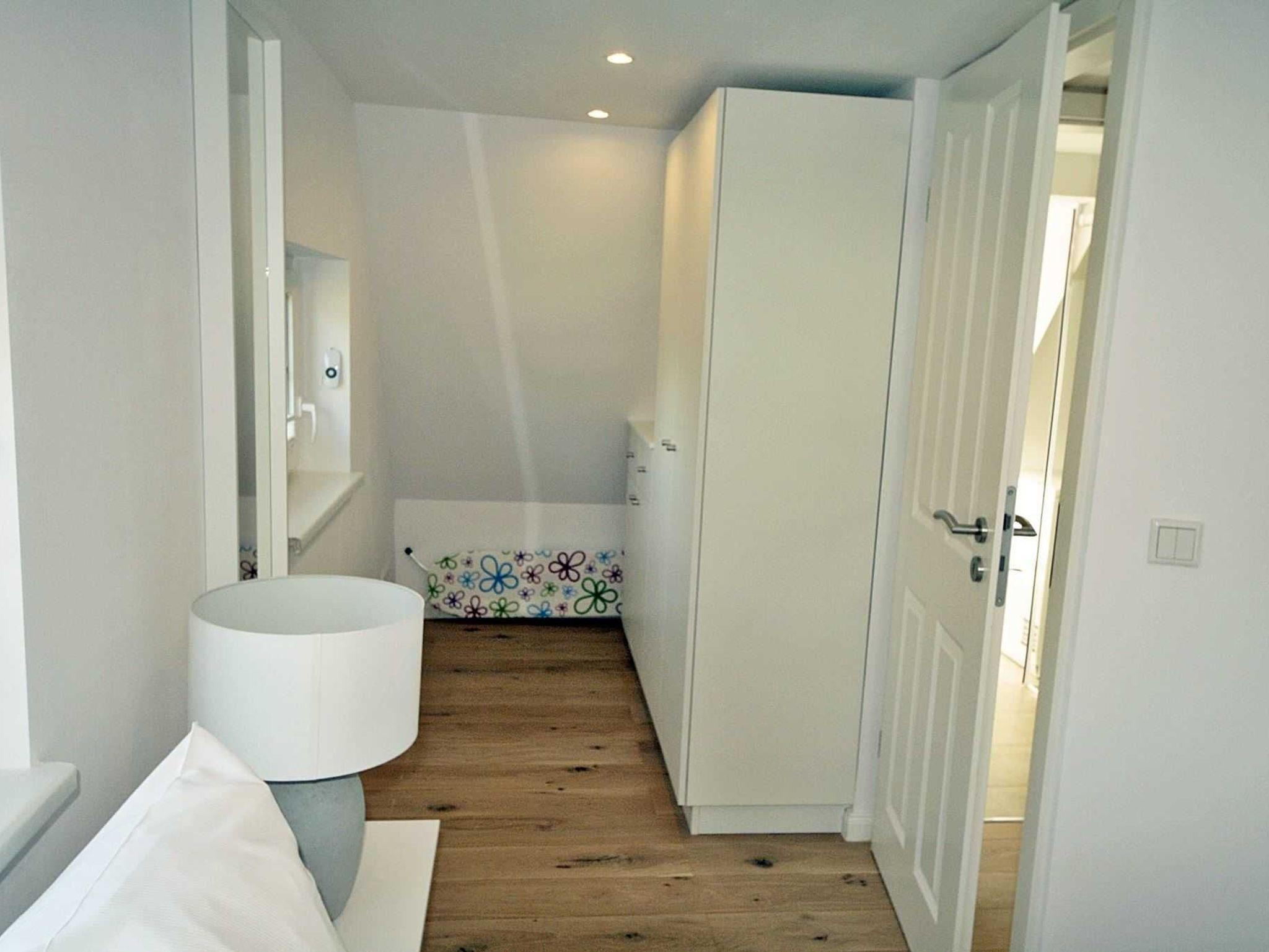 Im ersten Obergeschoss ist ein kleines verwinkeltes, dennoch charmantes Schlafzimmer vorzufinden. Das Bett hat die Größe 160x200cm. Das in beige gehaltene Bad im 1. OG verfügt über ein Waschbecken, eine ebenerdige Dusche und ein WC.