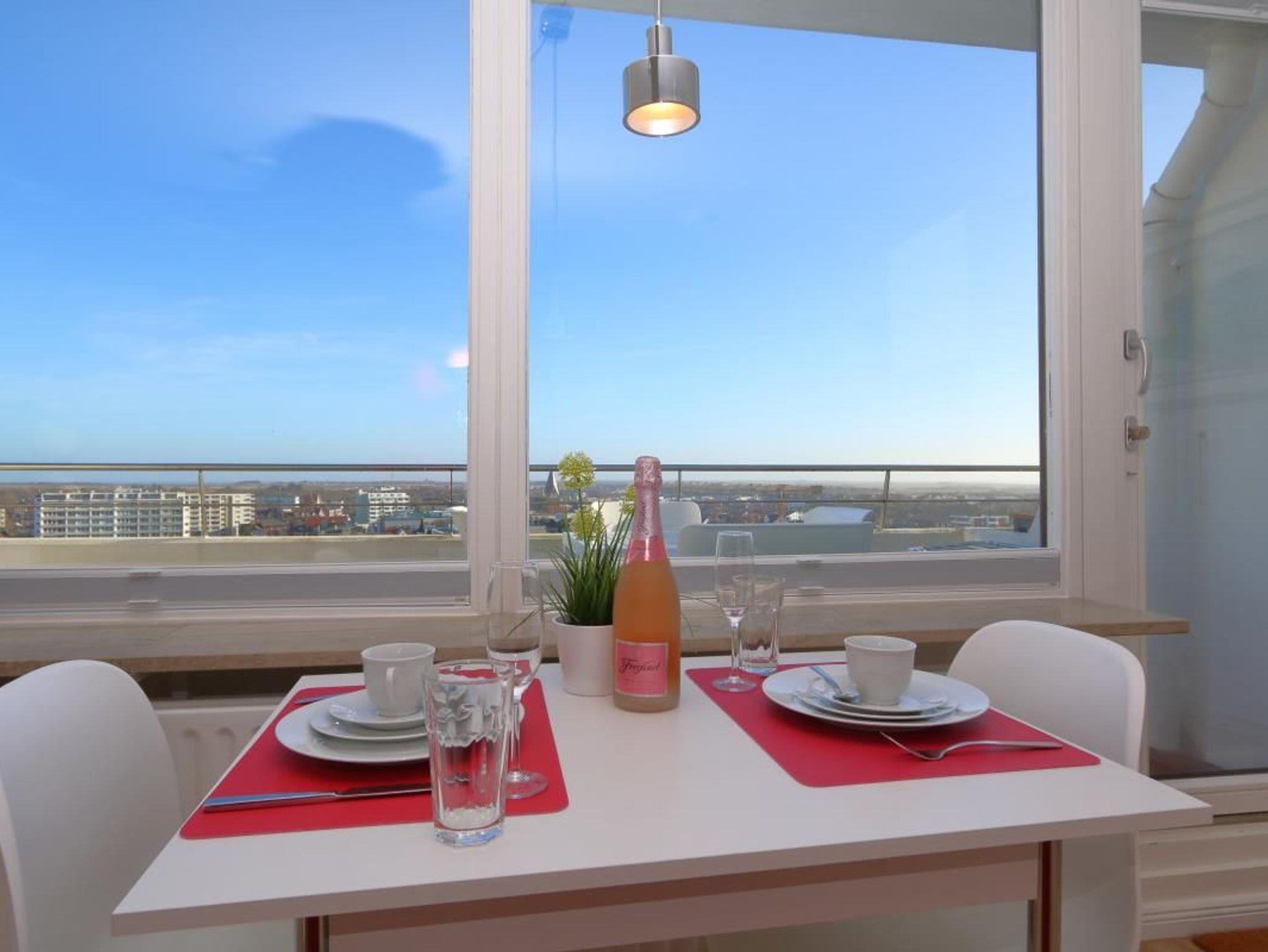 Lage: Das Appartement mit Ostbalkon und Stadtblick über das Flachdach befindet sich in der 8. Etage eines gepflegten Appartementhauses im Kurzentrum, direkt am Hauptstrand. Das Haus liegt zentral in Westerland, zwischen den beiden großen Fußgängerzonen.
