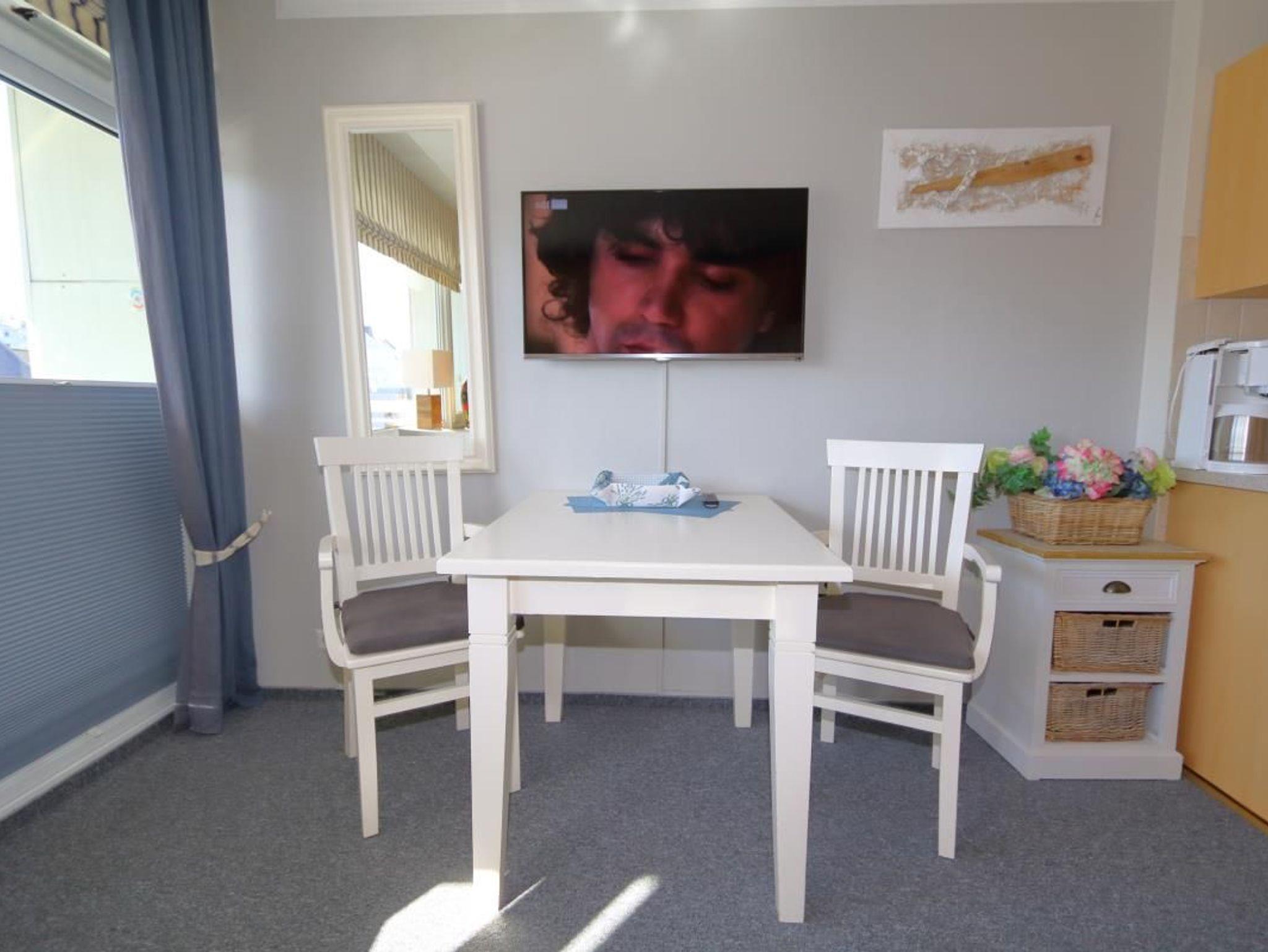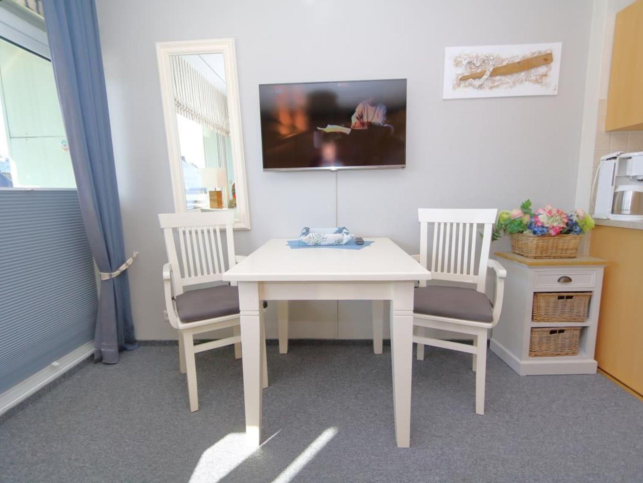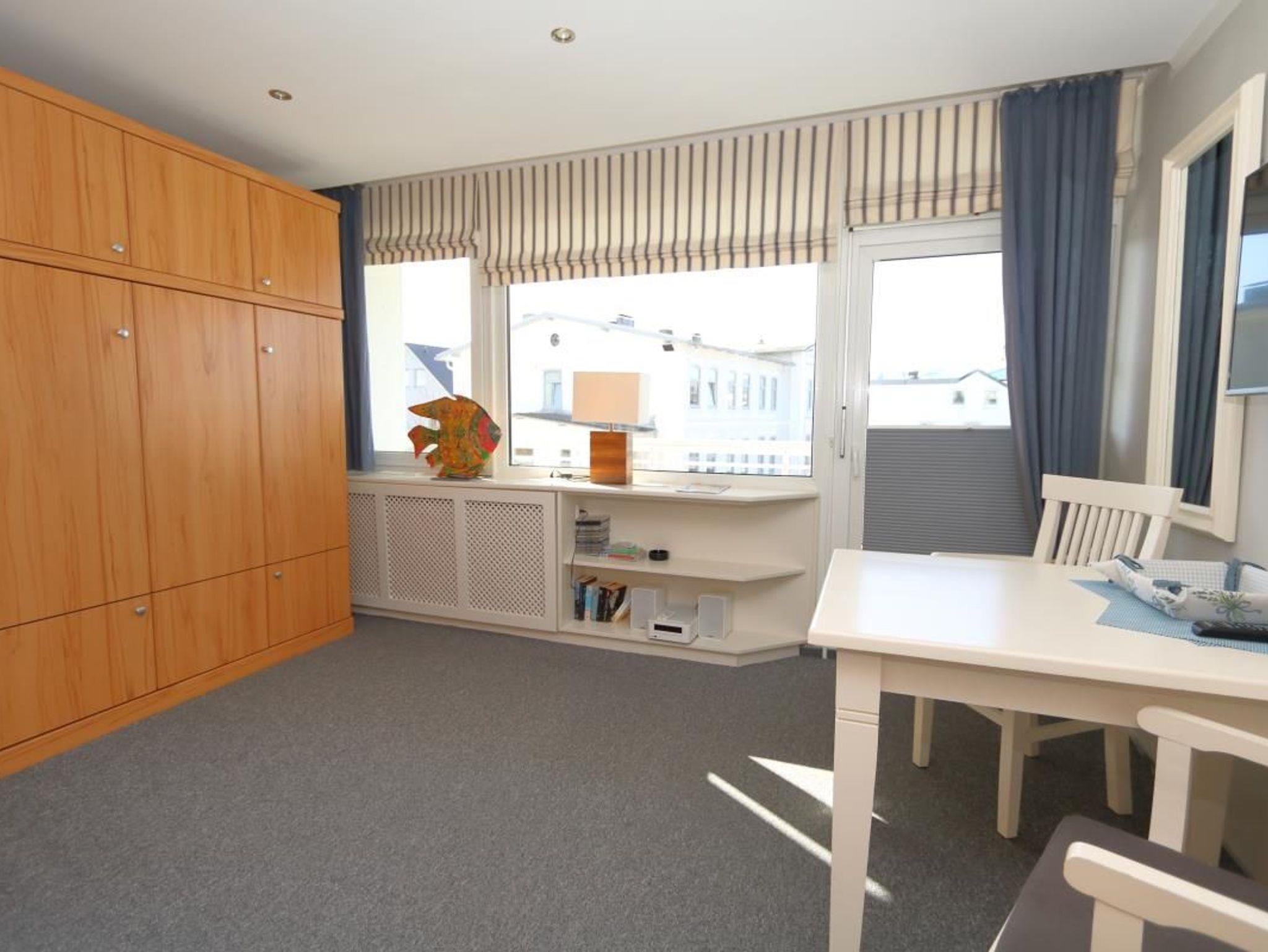 Das offene und helle Ferienappartement verfügt über einen Westbalkon, von dem aus man in Richtung der Friedrichstraße blicken kann. Der praktische Wohn-und Schlafbereich und das Bad mit Duschkabine und vorhandenem Föhn machen diese Ferienwohnung komplett.