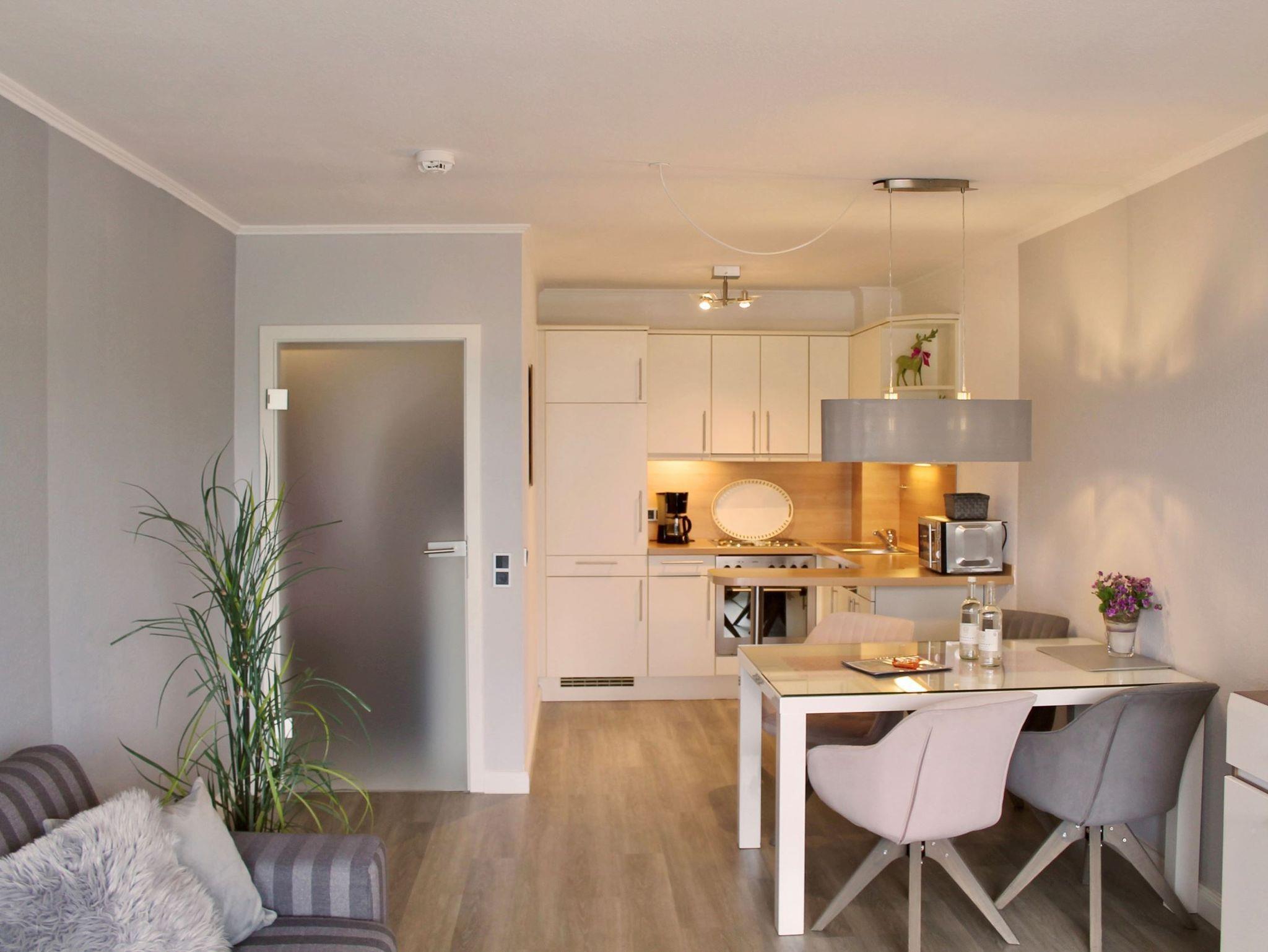 Das Appartement befindet sich im 1. Obergeschoss und ist in Richtung Westen ausgerichtet, wodurch es die letzten Sonnenstrahlen des Tages einfängt. Der Wohnbereich verfügt über ein gemütliches Schlafsofa, welches den Gast zum Erholen und Entspannen einlädt. Die integrierte, voll ausgestattete Küche lässt keine kulinarischen Wünsche offen, von der Mikrowelle bis zum Eierkocher werden Sie hier alle wichtigen Utensilien für ein gelungenes Mahl finden. Selbst für den morgendlichen Cappuccino steht eine Tassimo Kaffeemaschine bereit.