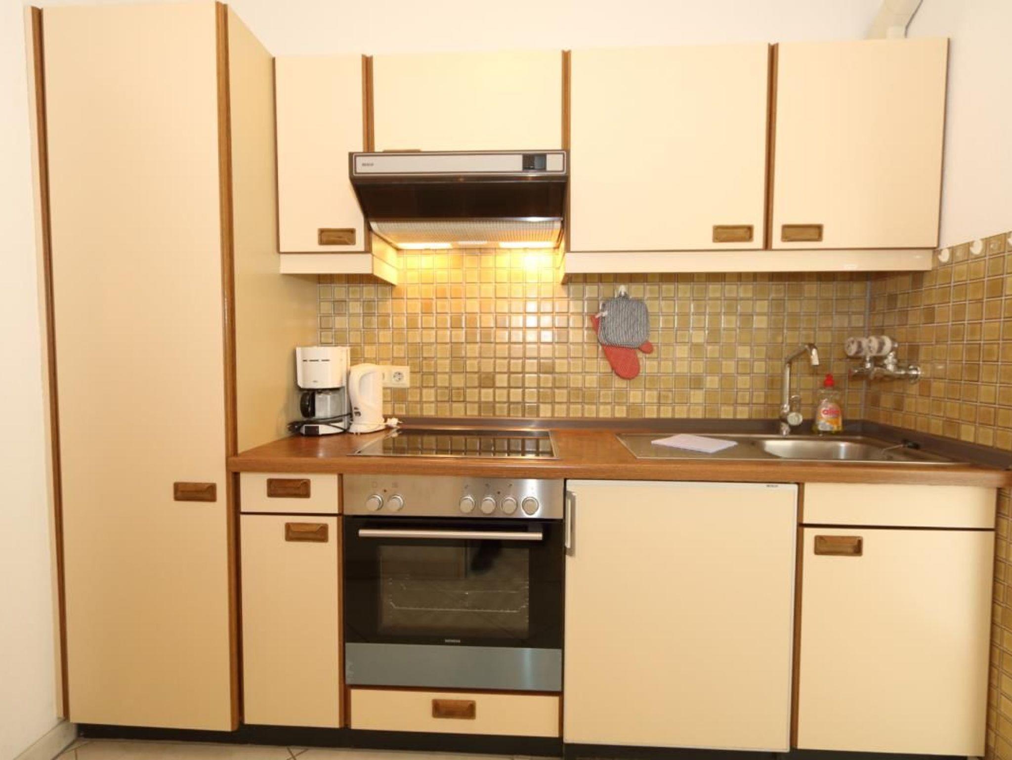 Küche mit Ceranfeld und Backofen, Dunstabzug, Kühlschrank mit Eisfach, Filter-Kaffeemaschine, elektrischer Wasserkocher und Toaster sind selbstverständlich.