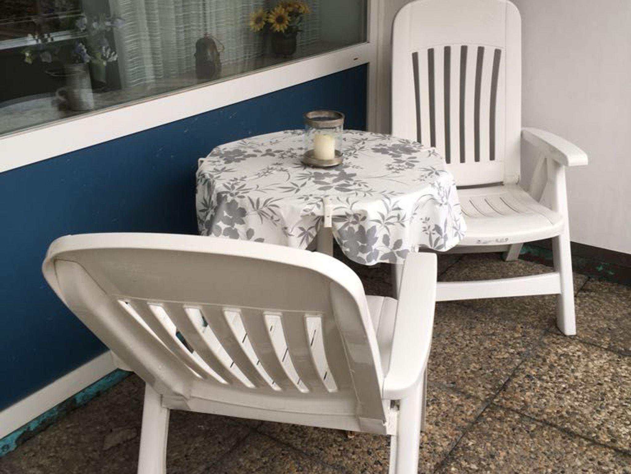 Möblierter Balkon, Radabstellplatz.