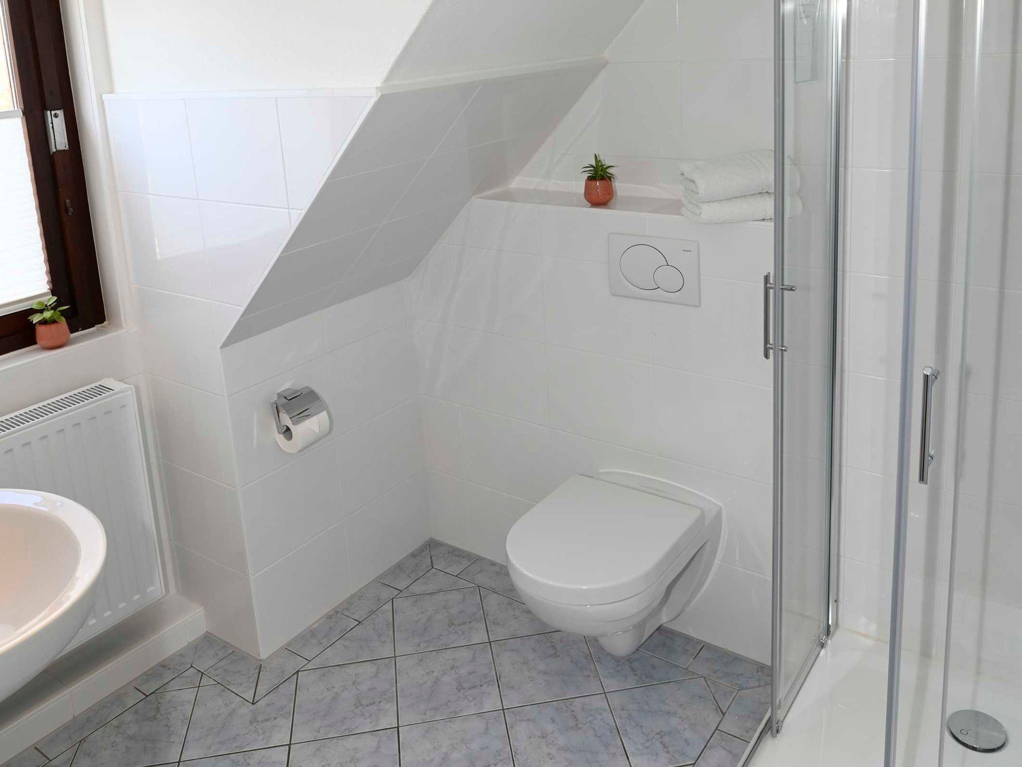 Zwei Bäder mit Dusche, WC, Waschbecken und Fön.