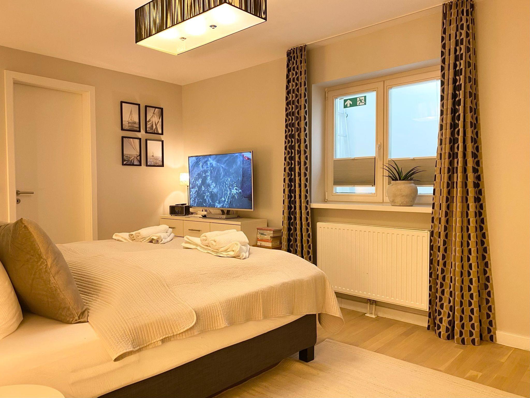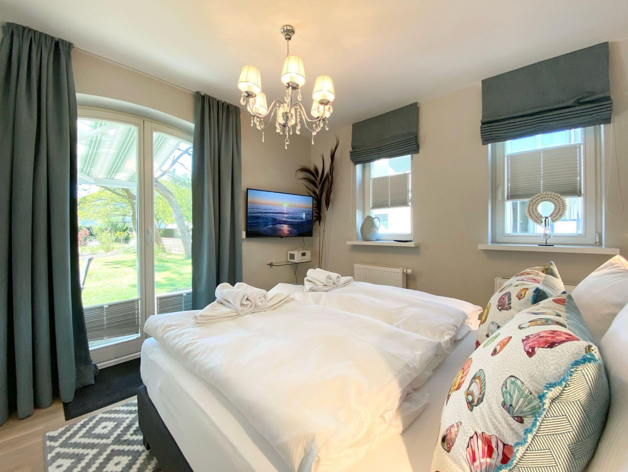 Ein Schlafzimmer im Erdgeschoss mit einem Boxspringbett (160x200 cm), TV und Digital-Radio/Bluetooth.