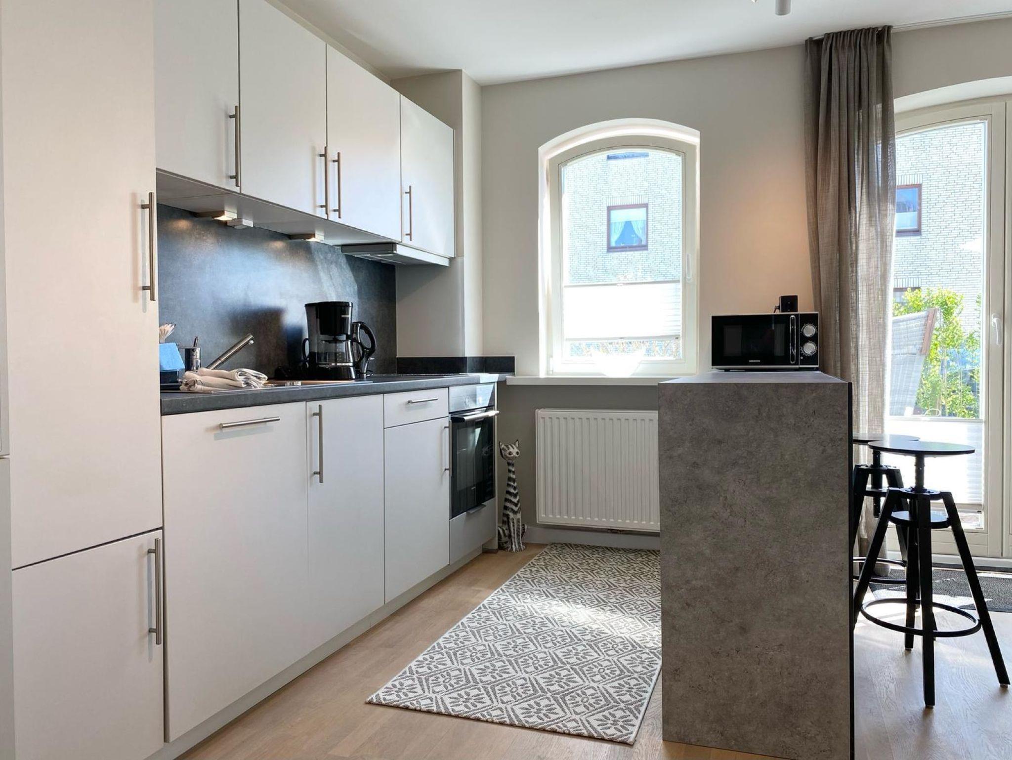 Küche: Die voll ausgestattete Küchennische lässt keine Wünsche offen. Sie verfügt über ein Ceran-Kochfeld, Backofen, Geschirrspüler, Kühlschrank mit Gefrierfach sowie eine Filter-Kaffeemaschine, Wasserkocher und Toaster. Alles, was Sie für die Zubereitung Ihrer Mahlzeiten benötigen, ist vorhanden.