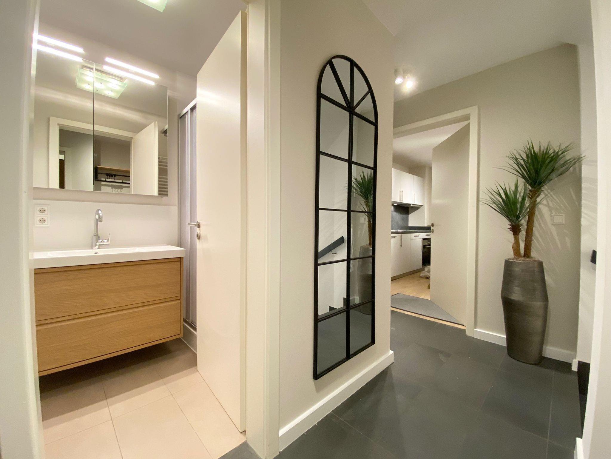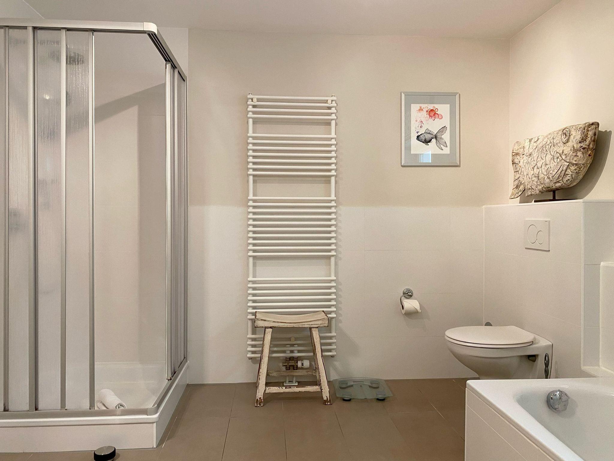 Ein weiteres, großzügigeres Bad im Untergeschoss mit Dusche, separater Badewanne und Föhn.
