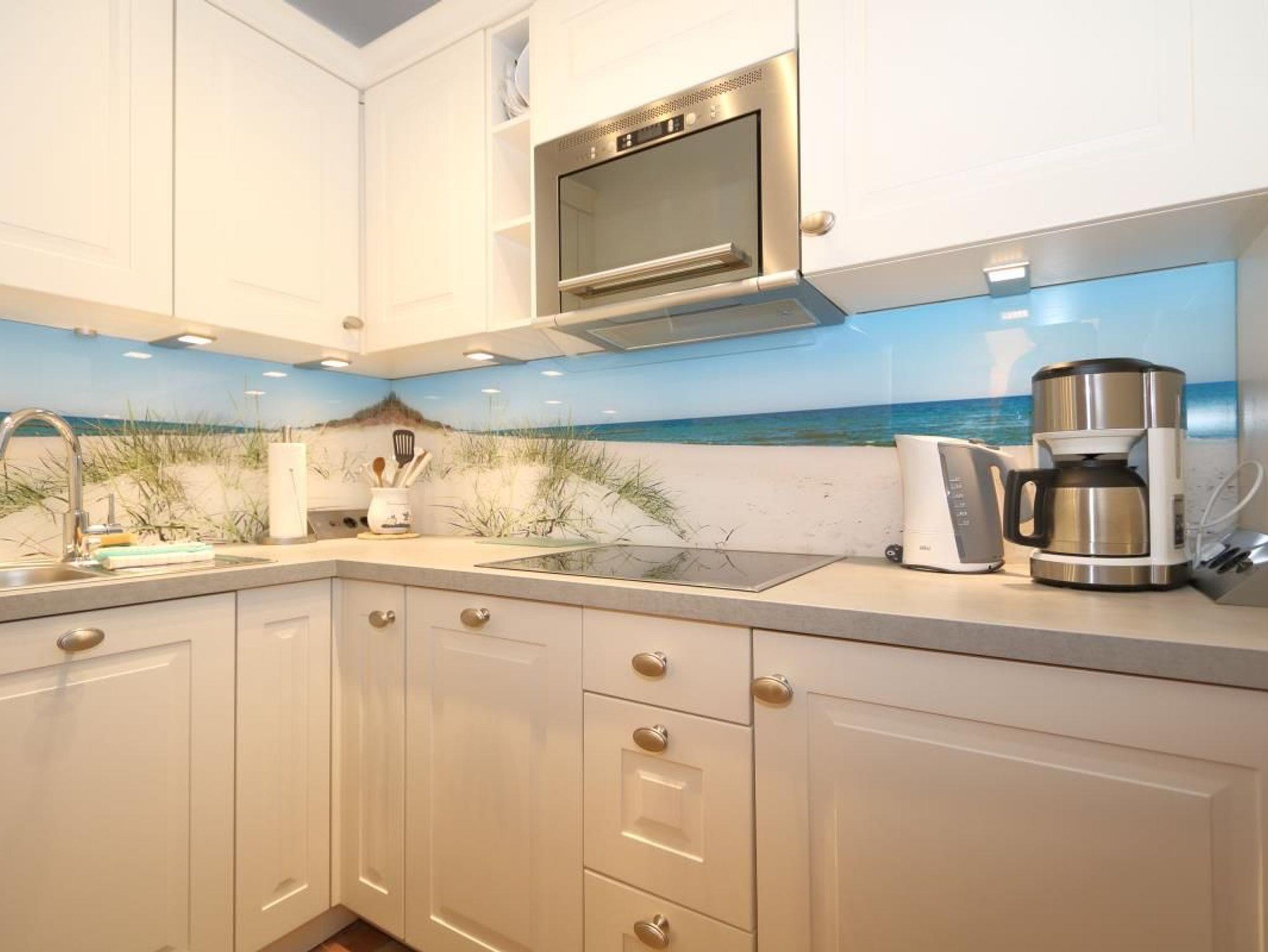 Küche mit Ceranfeld, Mikrowelle, Kühlschrank mit Eisfach, Filter-Kaffeemaschine, elektrischer Wasserkocher und Toaster sind selbstverständlich.