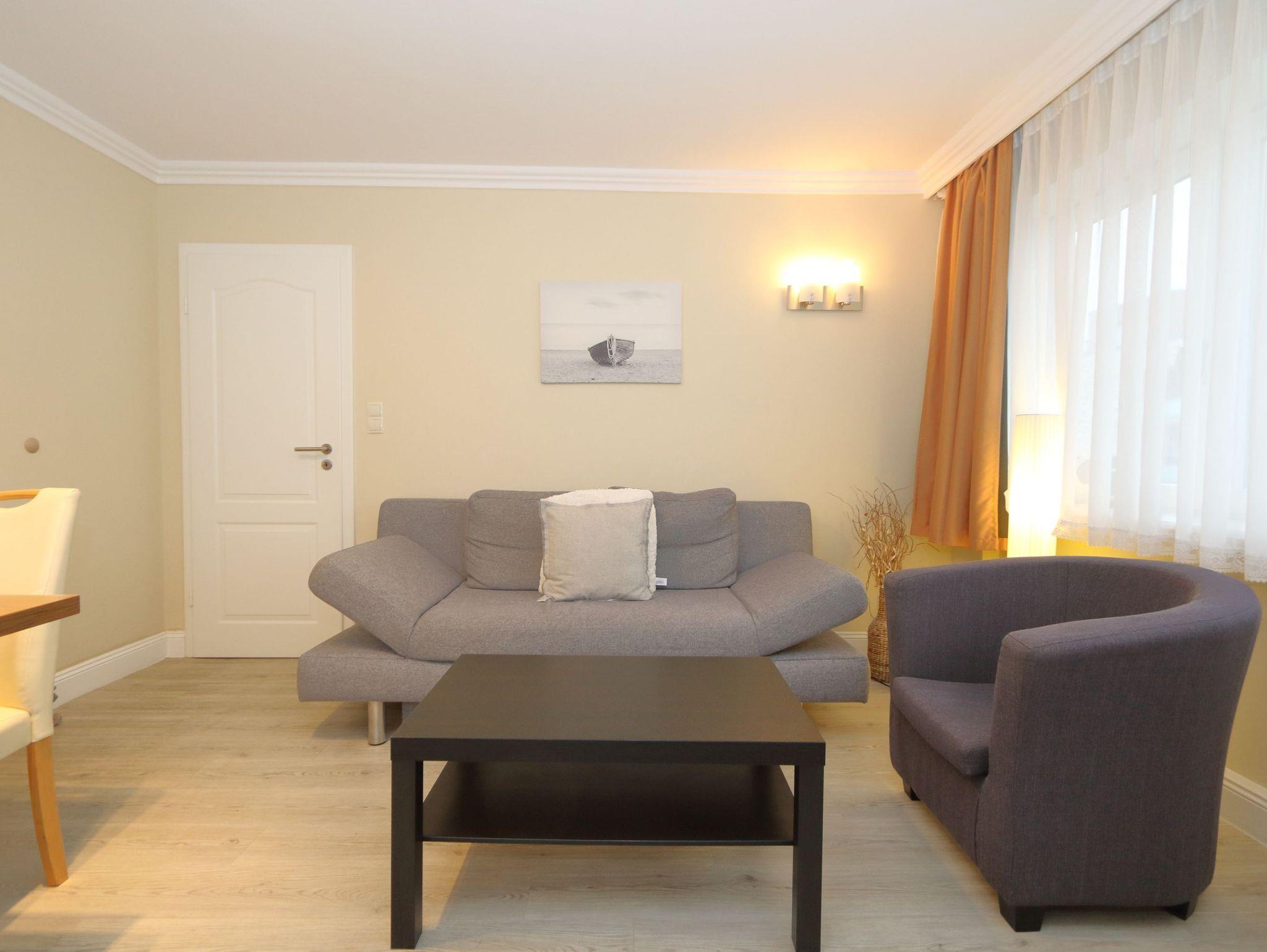 Im Wohnzimmer ist eine bequeme Schlaf-Couchgarnitur mit Clubtisch und Sessel. Eine kleine Eßecke für 4 Personen schließt sich daran an.