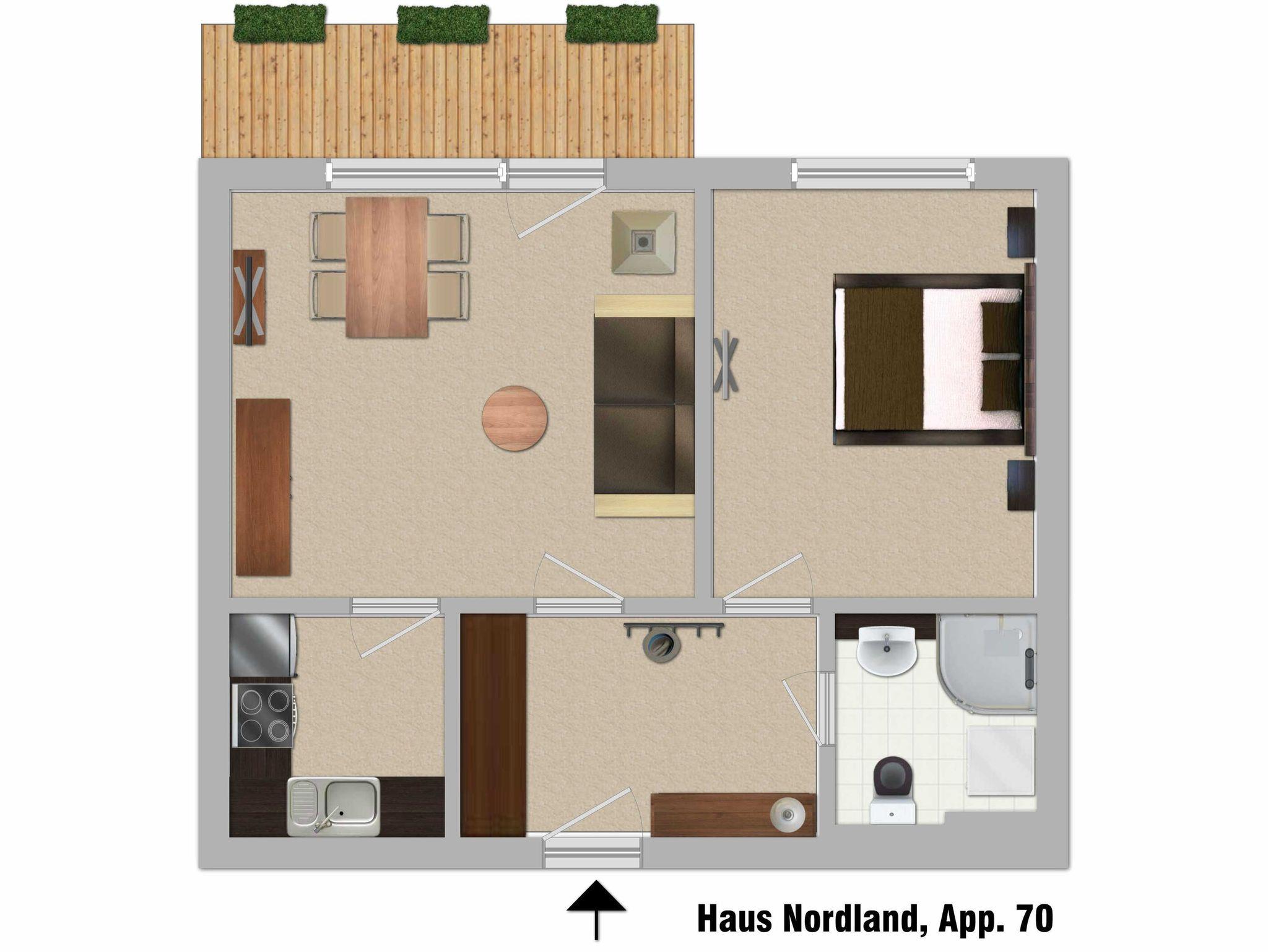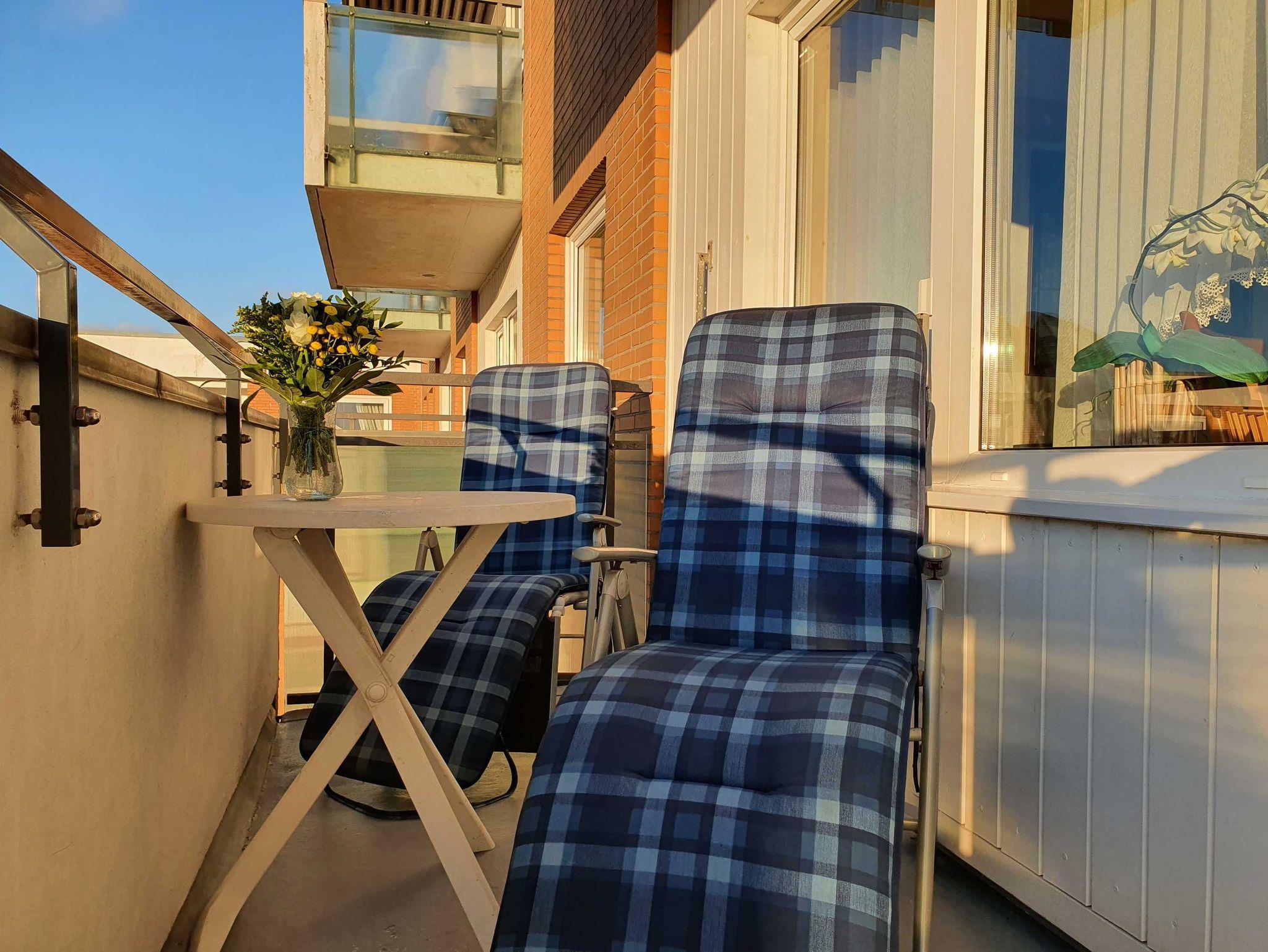 2-Zimmer-Ferienwohnung (3.OG, Wohnung 70) mit gehobener Ausstattung für 2 Personen (ca. 39 m²) mit Wohn- und Esszimmer, Schlafzimmer, Küche, Bad und Balkon.