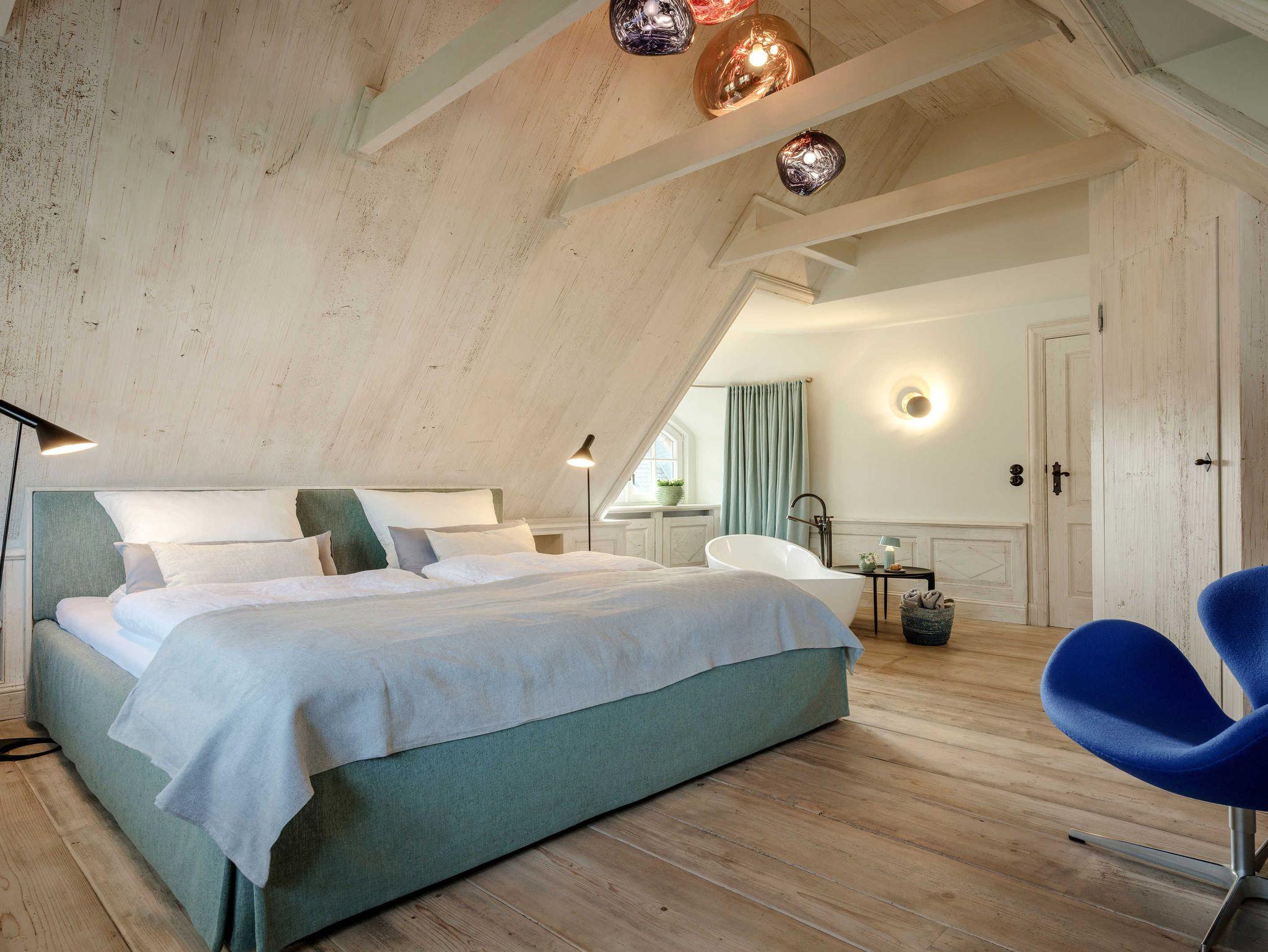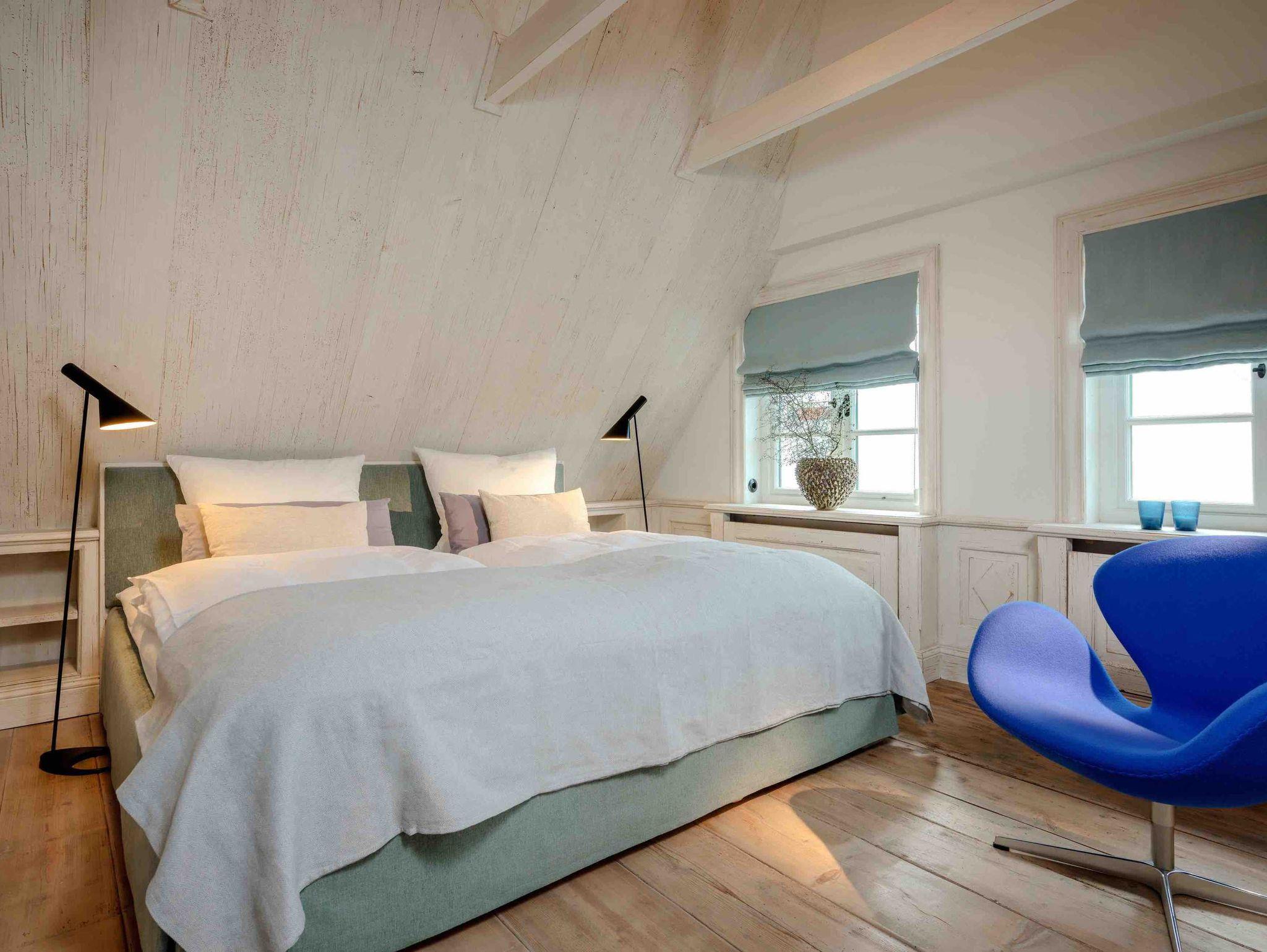 Auf 125 qm befindet sich ein Master Bedroom - (Bett 2x2,10 m Samina Schlafsystem) + freistehender Badewanne sowie ein zweites Schlafzimmer (Bett 2 x 2 m) und SAMINA Kissenbar, einem kleinen Bad im Obergeschoss sowie ein großes Bad mit Regendusche im Erdgeschoss.