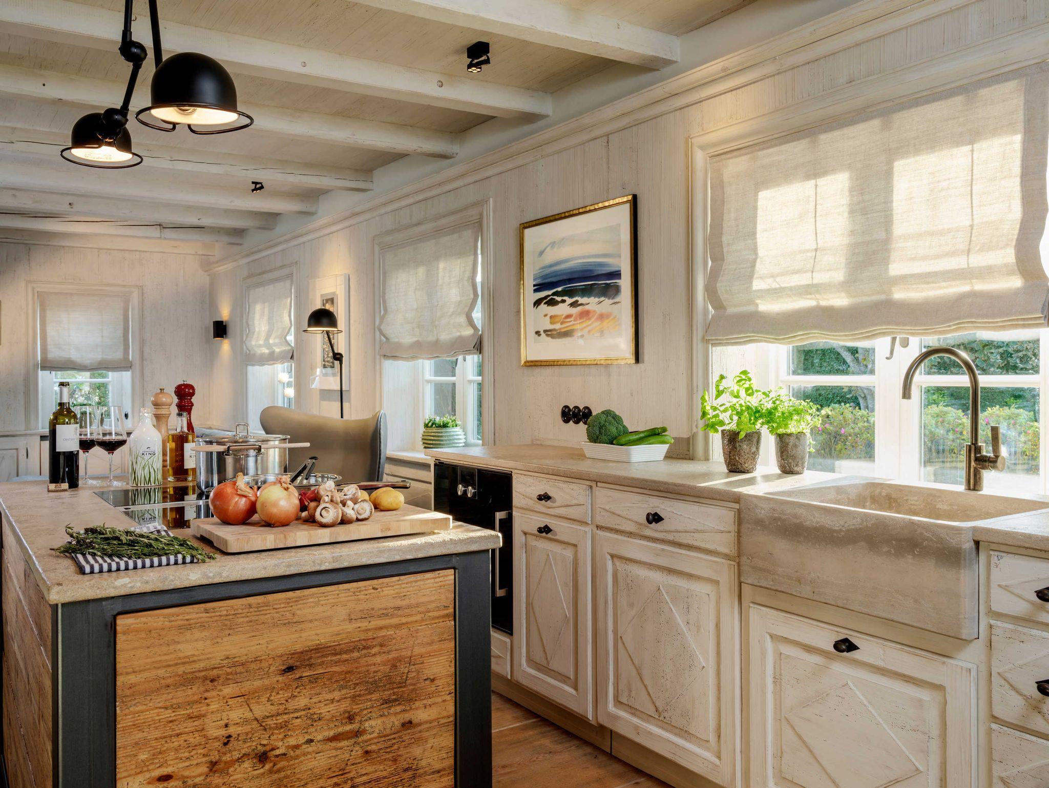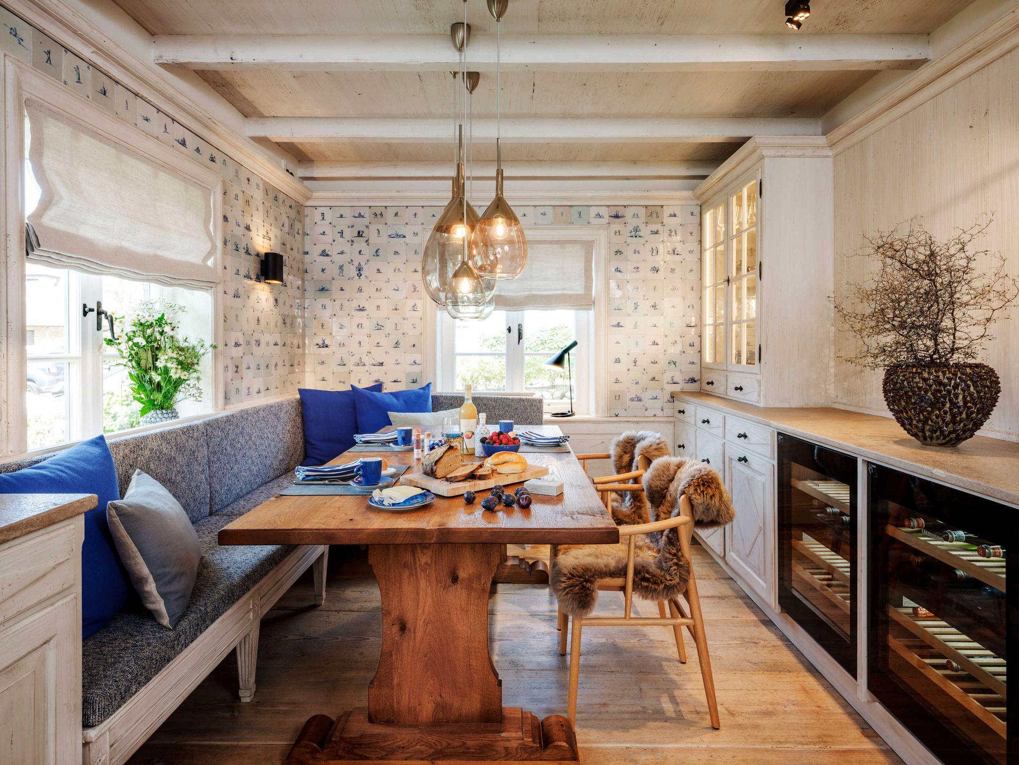 Der offene Wohnraum mit gekalkten Fichtendielen aus dem 17. Jahrhundert verwöhnt mit jeglichem Komfort, Highlight ist auch hier ein schwedischer Kachelofen.