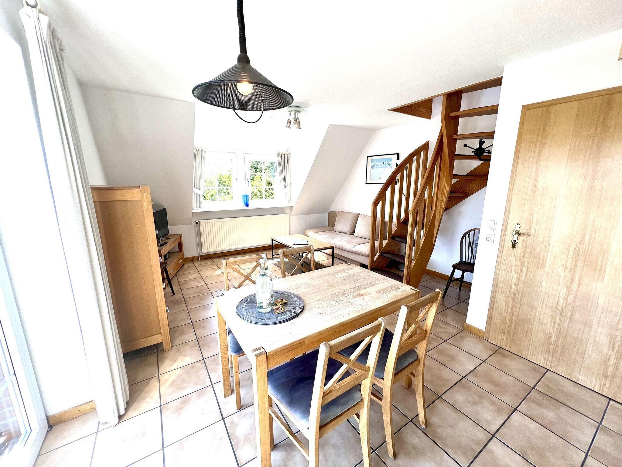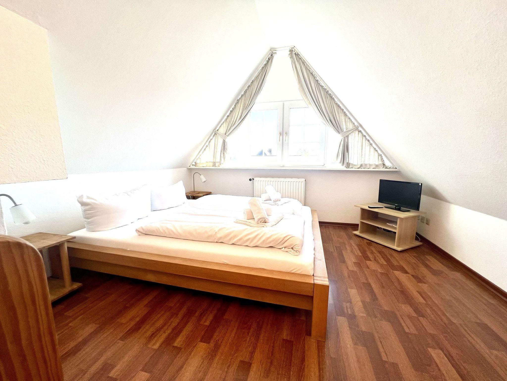 Zentral gelegene Ferienwohnung mit ca. 50 qm. Verteilt über 1. Obergeschoss und Dachgeschoss mit französischem Balkon. Im 1. Obergeschoss finden Sie den Wohnraum mit Küchenzeile sowie das geräumige Duschbad. Eine steile Wendeltreppe führt Sie ins Dachgeschoss, wo Sie Ihr Schlafzimmer vorfinden. Hier ist ein weiterer Fernseher für Sie bereitgestellt.