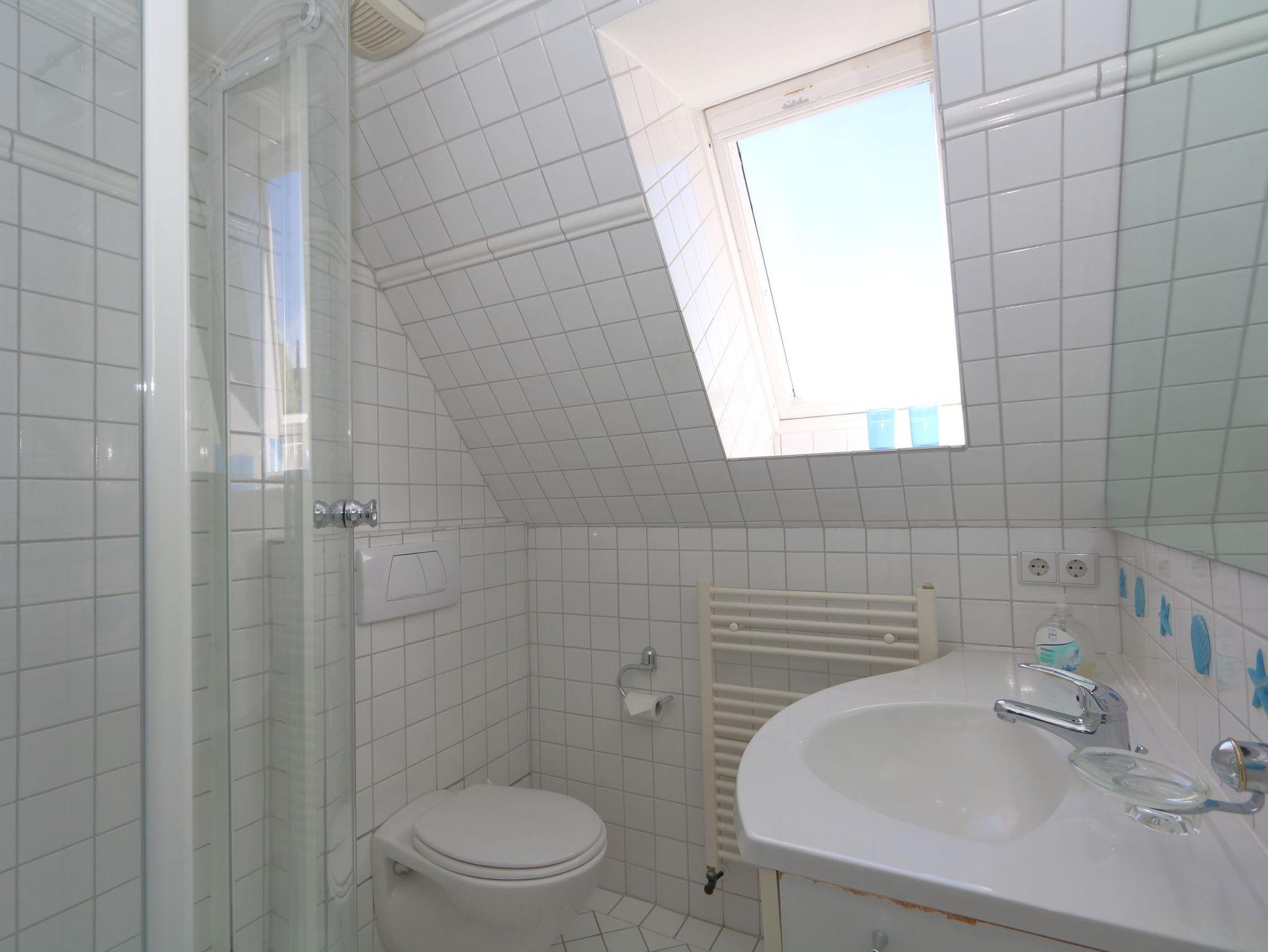 Das Wohnzimmer hat eine bequeme Couchgarnitur, die auch als Schlafgelegenheit dienen kann. Die im Wohnzimmer untergebrachte Küchenzeile ist komplett ausgestattet. Die gesamte Wohnung ist im „Laura Ashley“ Stil eingerichtet und hat viele liebevolle Details. Vom Schlafzimmer mit dem Doppelbett gelangt man auf die uneinsehbare Dachterrasse mit Balkonmöbeln und Strandkorb. Im Bad mit Dachfenster ist eine Dusche.