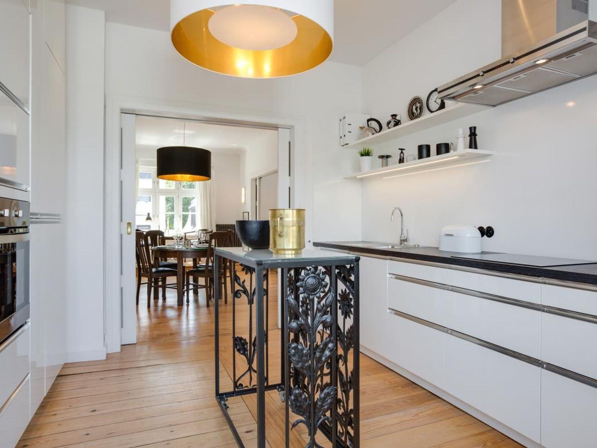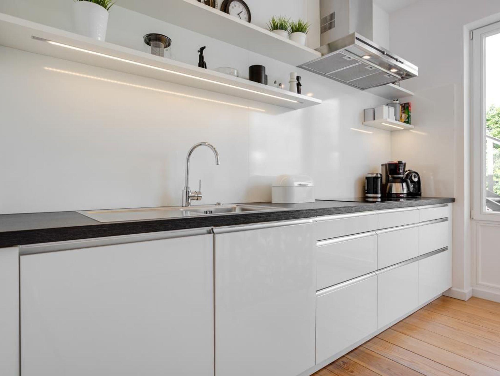 Ihre voll ausgestattete Küche ist nicht minder beeindruckend: alles ist puristisch Weiß, auch hier wurde Ihre weiß-goldene Deckenleuchte eigens in einer Leuchtenmanufaktur angefertigt.