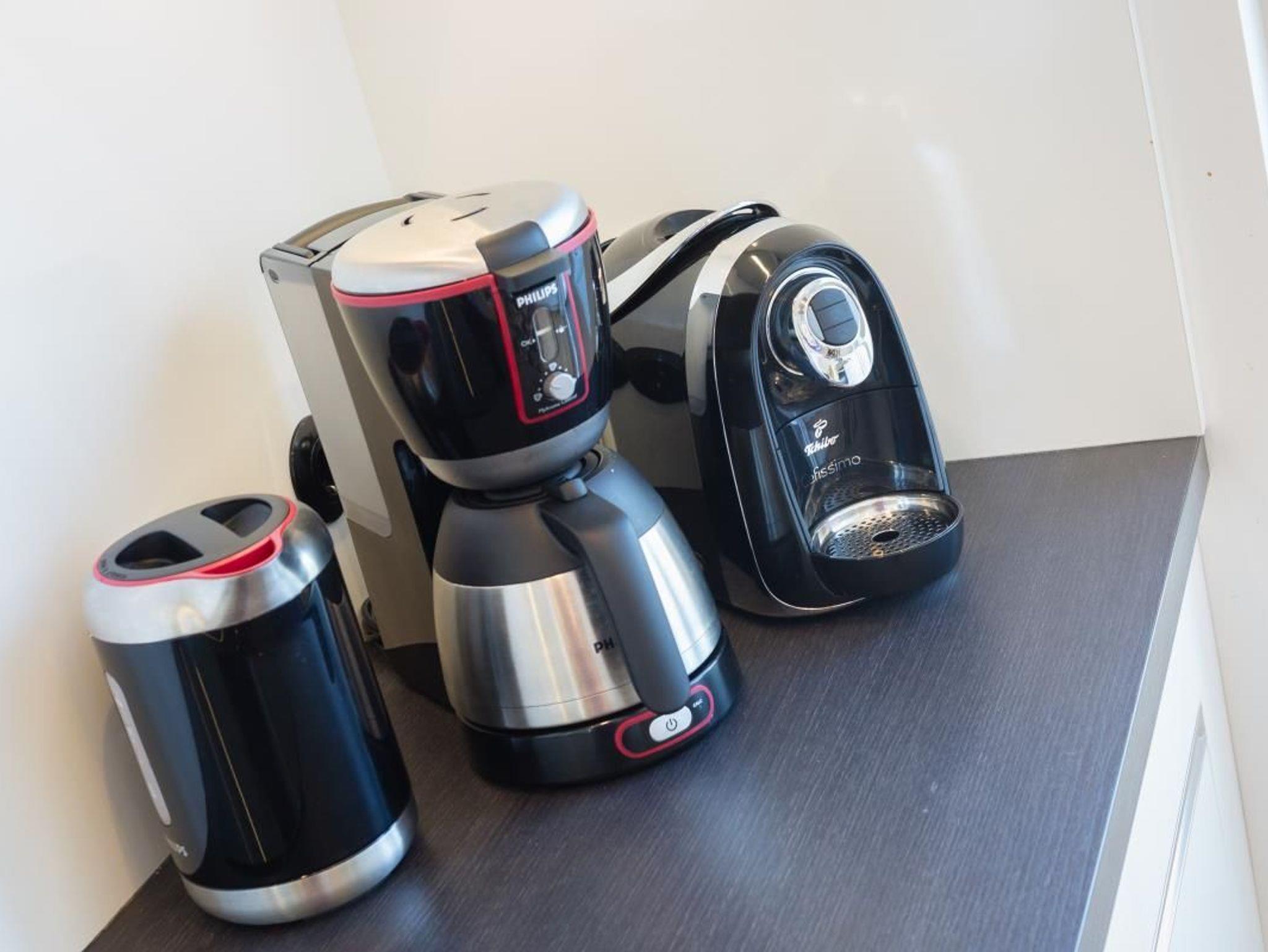 Herd mit mehreren Platten, Backofen, Mikrowelle, Nespressomaschine, Dunstabzugshaube, großer Kühlschrank mit Gefrierfach, Wasserkocher,Filterkaffeemaschine, Toaster