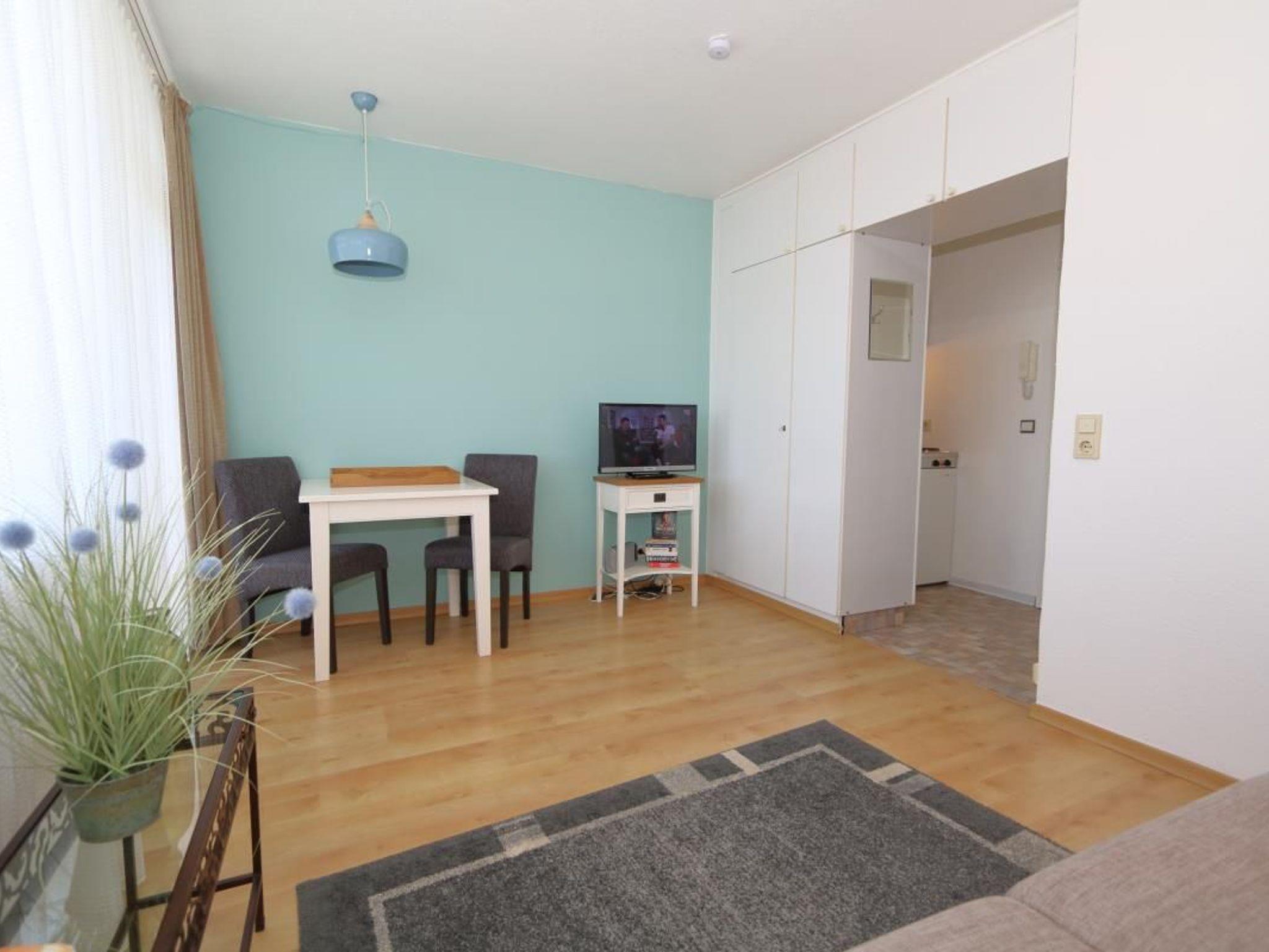 Das Wohnzimmer des Appartements ist mit einer Schlafcouch (1,40 m Liegebreite) und dem Essplatz eingerichtet. Auf dem Westbalkon kann man die Nachmittagssonne genießen. Eine kleine Pantryküche bietet entsprechende Möglichkeit zu kochen. Das Bad hat eine Dusche.