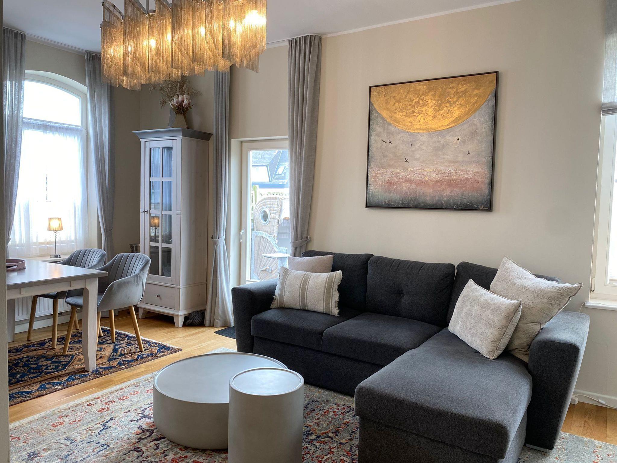 Wohn- und Essbereich: Der einladende Wohnbereich bildet den Mittelpunkt der Wohnung. Hier entspannen Sie auf der komfortablen Sitzgarnitur, genießen Filme auf dem 3D-Flachbild-TV und speisen am gemütlichen Esstisch. Profitieren Sie vom kostenlosen WLAN-Zugang.