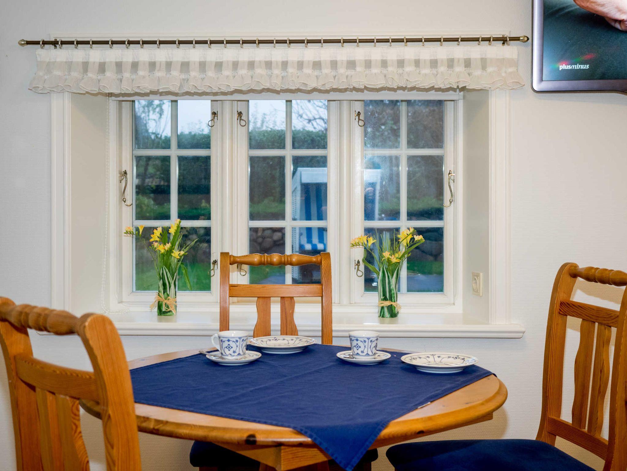 Die Ferienwohnung für 1-2 Person (ca. 37m²) befindet sich im Parterre und Obergeschoss (Dachschrägen) eines 1 1/2-geschossigen reetgedeckten Friesenhauses mit 2 Wohneinheiten. Wohnzimmer mit 2 gemütlichen Sesseln und Hocker, Esstisch mit 3 Stühlen, Einbauschränken, Parkettfußboden. Schlafzimmer mit Teppichboden (1. Etage) mit 2 getrennt stehenden Einzelbetten. Gartenbenutzung mit eigenem Strandkorb und Gartenmöbeln. Haustiere sind nicht erlaubt! Auf Rücksicht der nachfolgenden Gäste ist das Rauchen in diesem Objekt nicht gestattet. WLAN vorhanden.
