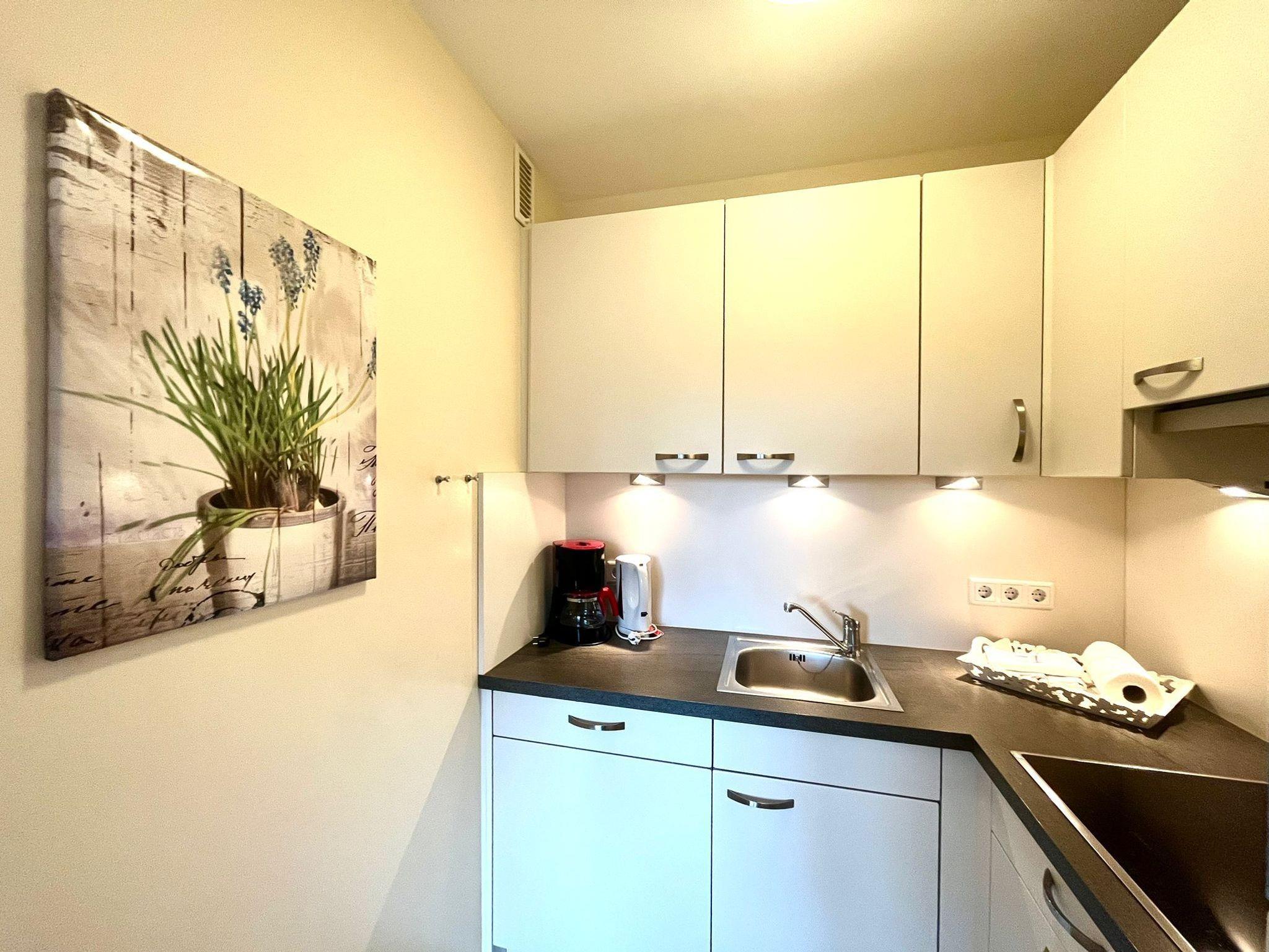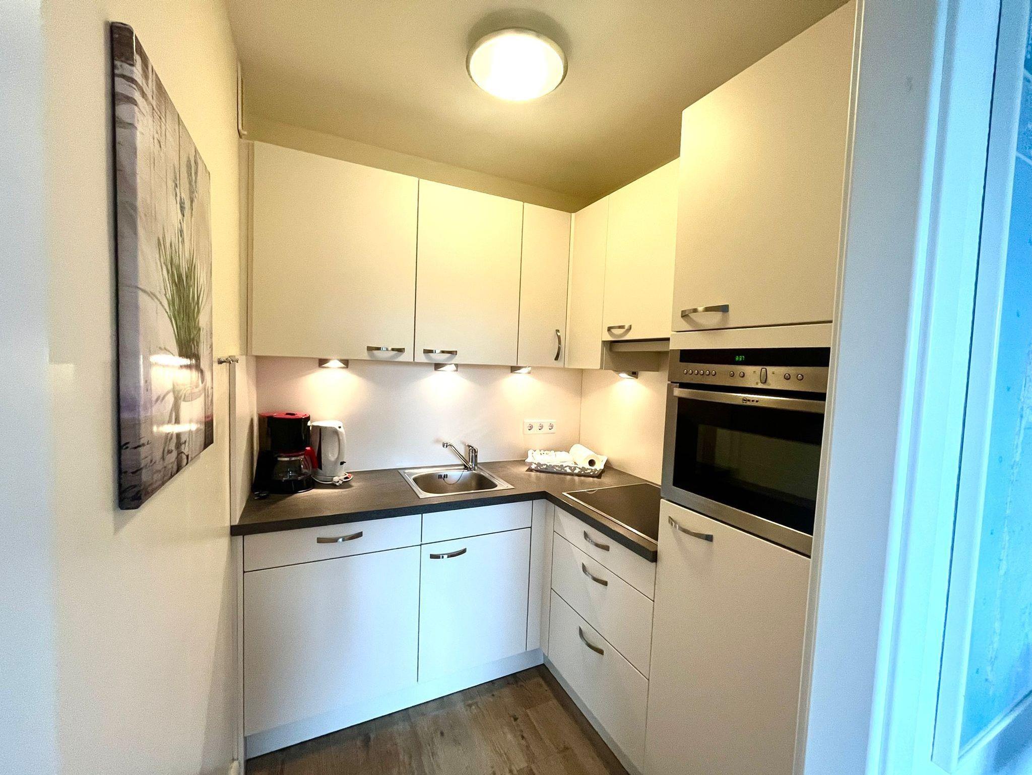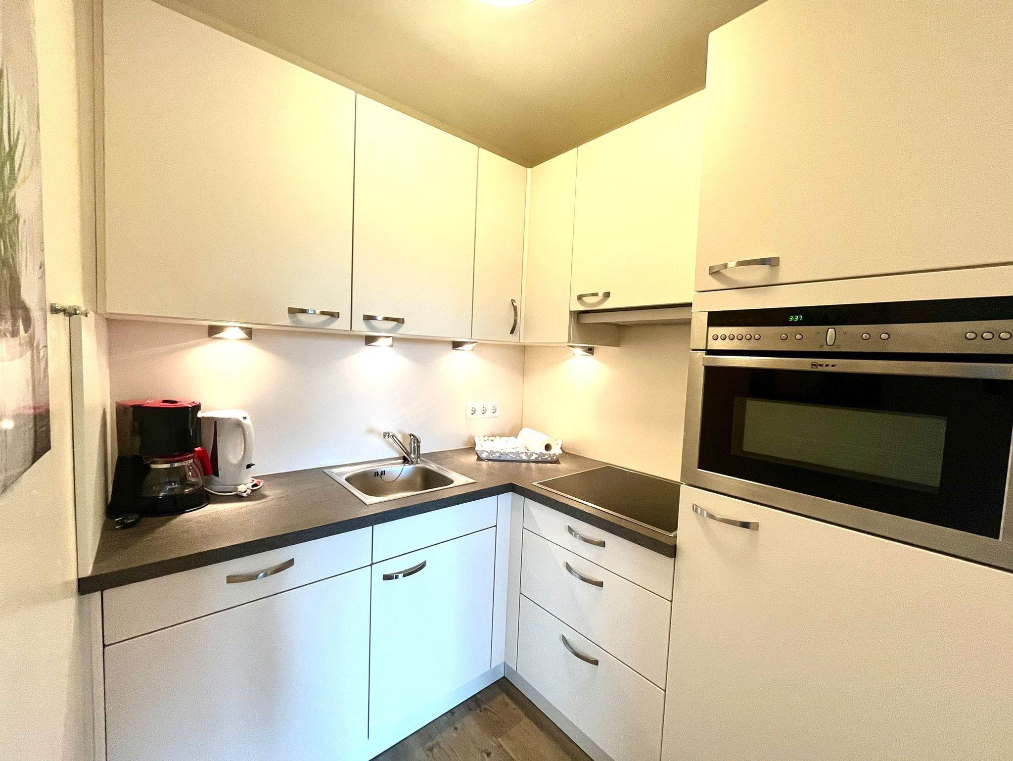 Separate und neuwertige Küche mit Cerankochfeld, Backofen, Geschirrspüler, Mikrowelle, Kühlschrank mit Gefrierfach, Kaffeemaschine, Wasserkocher und reichlich Geschirr für den täglichen Bedarf sind selbstverständlich.