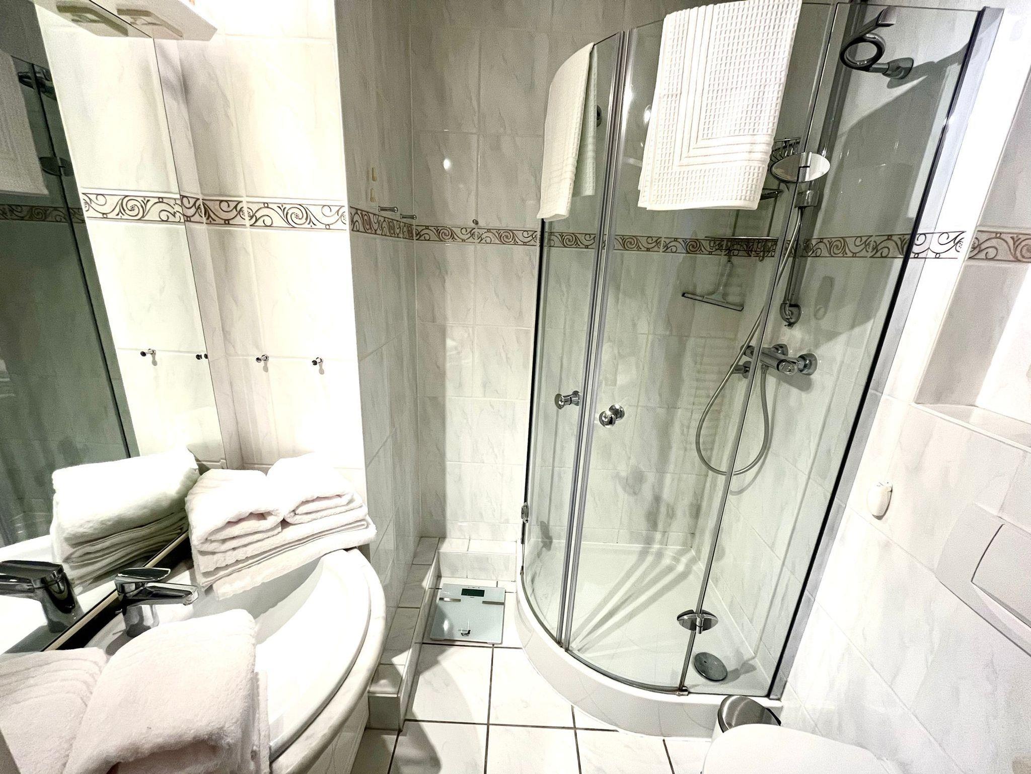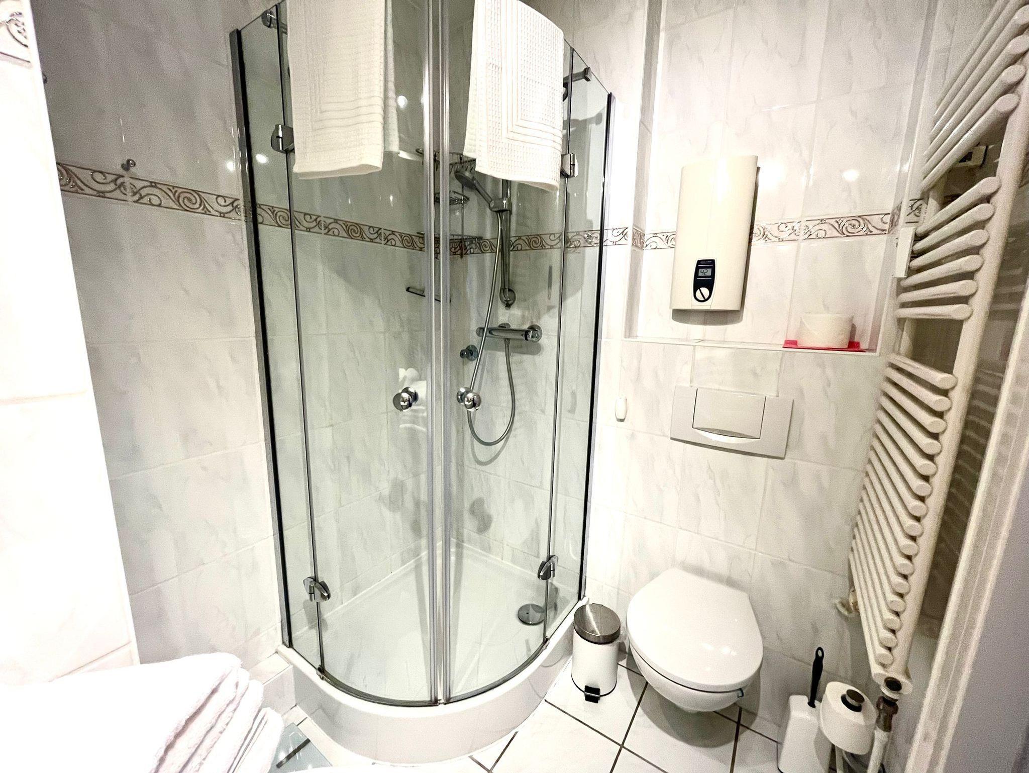 Ein modernes Bad mit Dusche, Waschtisch, WC und Haartrockner.