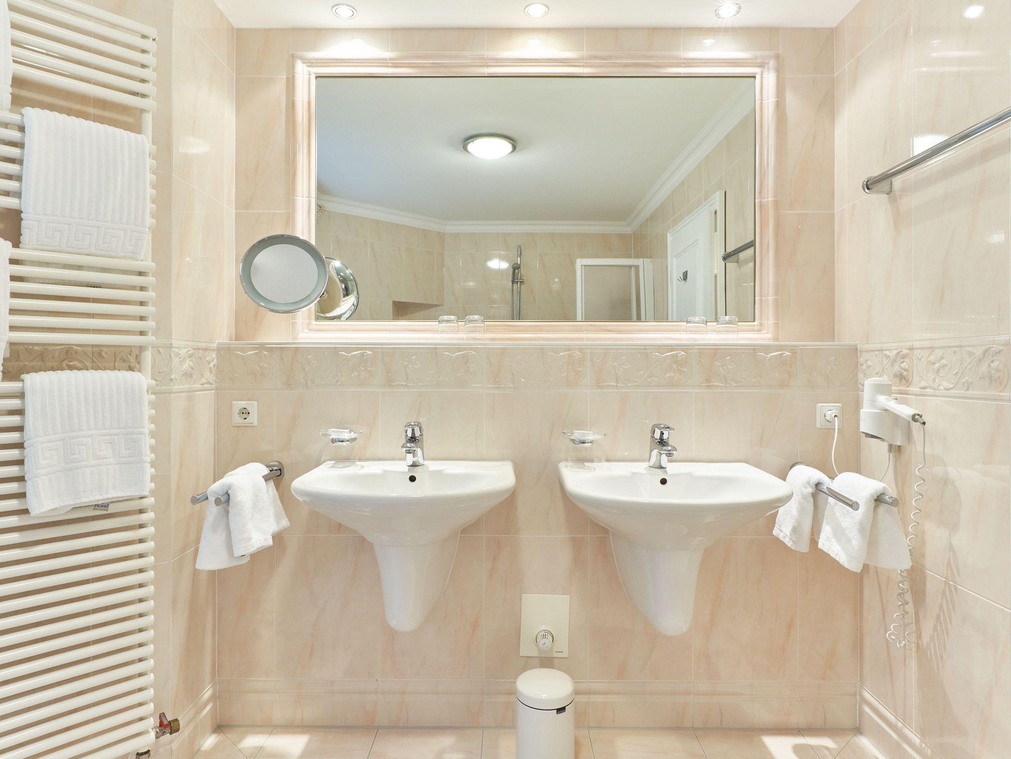 Zwei Badezimmer, einmal mit Wanne, Doppelwaschbecken und WC und ein Duschbad mit WC.