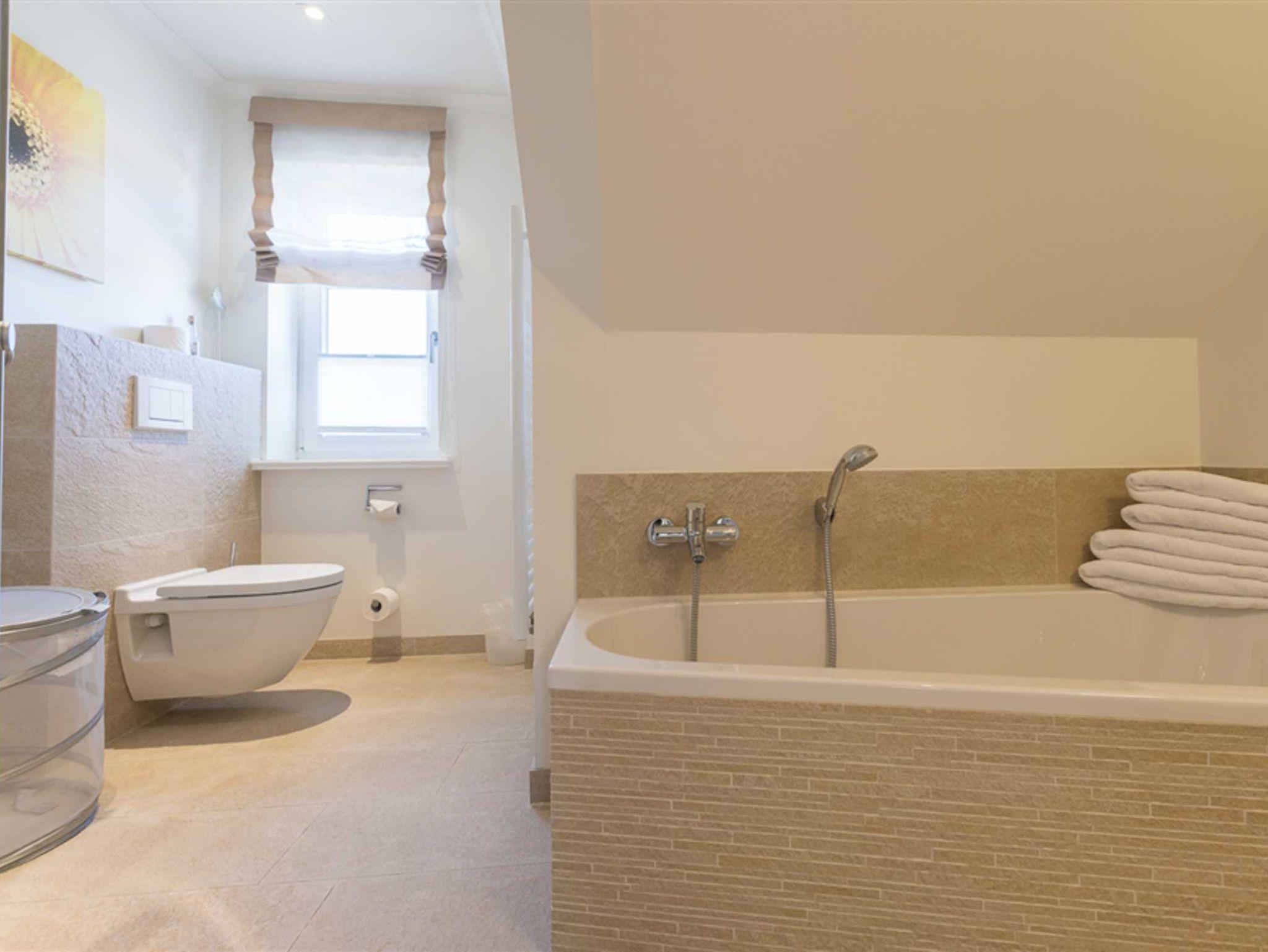 Im 1.OG befinden sich ebenfalls 2 Schlafzimmer mit jeweils einem Doppelbett. 1 SZ mit Balkon und herrlicher Sicht Richtung aufgehender Sonne. Außerdem haben Sie auf dieser Ebene ebenfalls ein sehr schönes Bad mit WC, Badewanne und Dusche.