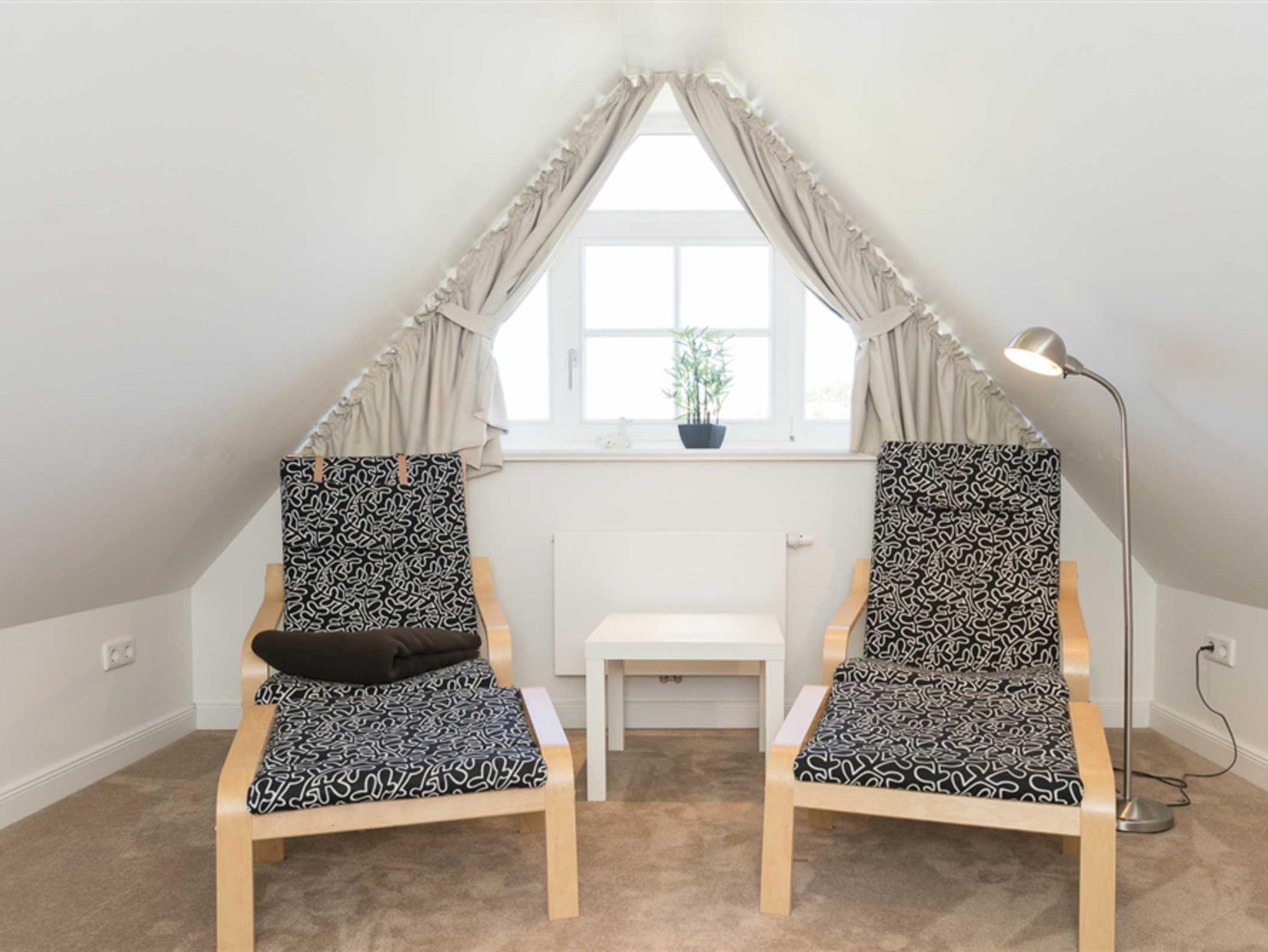 Im Dachgeschoss befindet sich noch ein zweiter Wohnraum mit Relax-Sesseln und Flat-TV mit DVD-Player als Rückzugsgebiet für ruhige Stunden.