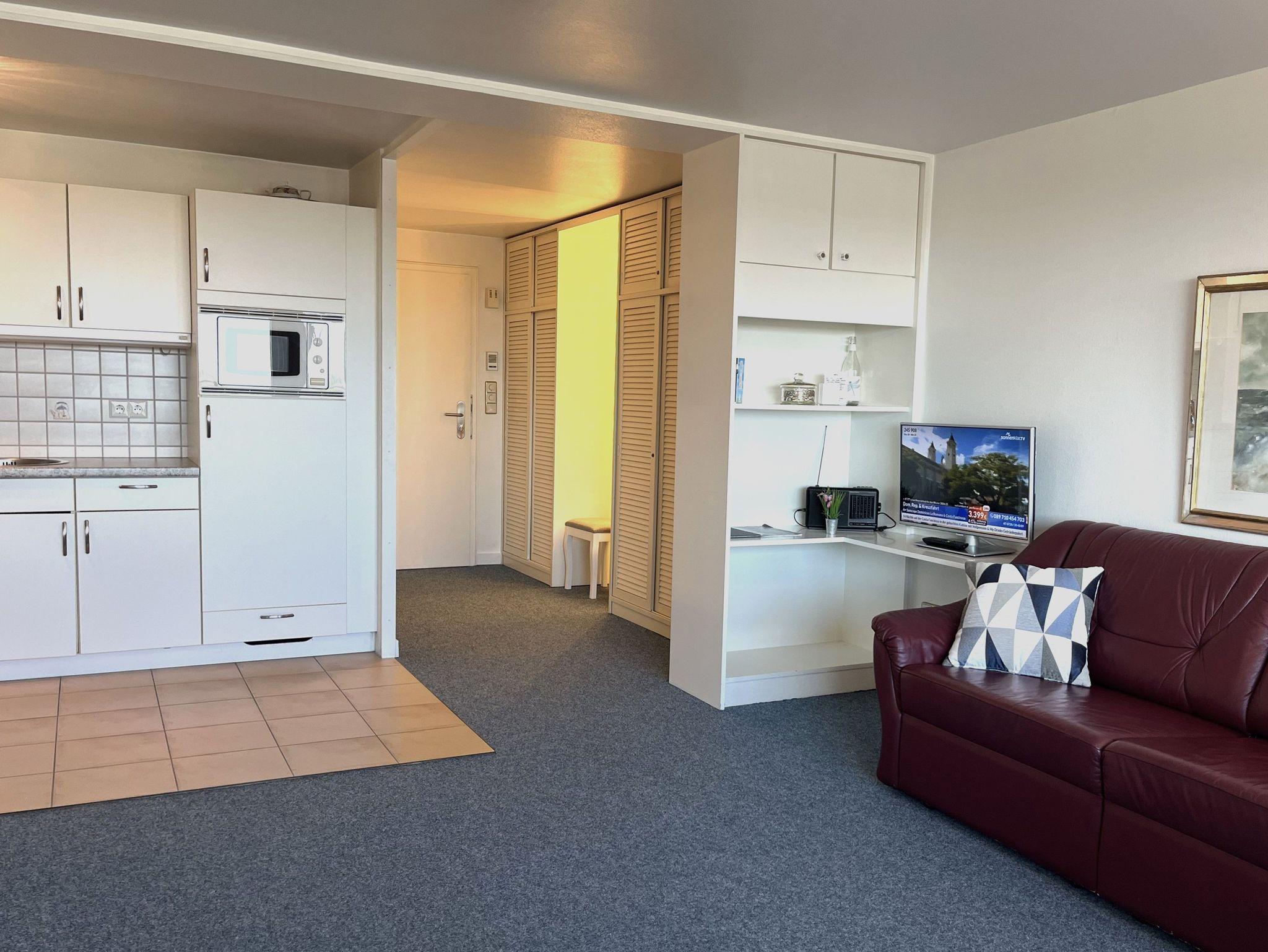 Ein kombinierter Wohn-Schlafraum mit Ledersofa, Flachbild-TV, Doppelschrankbett und Essecke ist der Mittelpunkt dieser hell eingerichteten Wohnung mit neuem Teppichboden. Im Vorraum sorgt ein großer Einbauschrank für reichlich Stauraum.