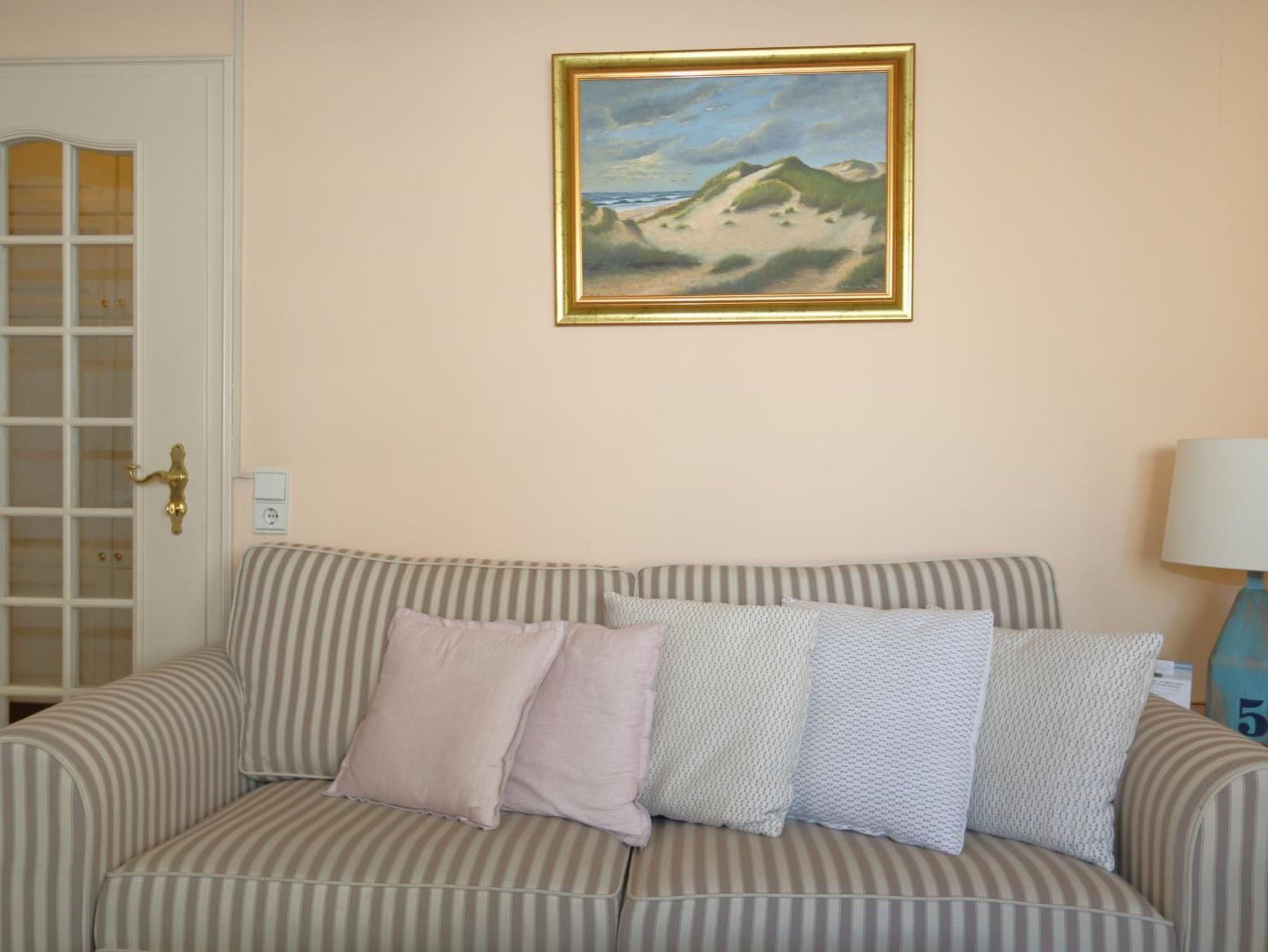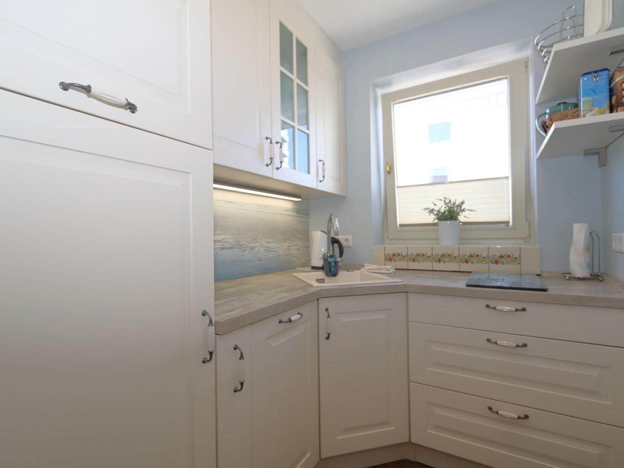 Das sehr gemütlich und seniorengerecht eingerichtete Appartement hat eine separate Küche mit Fenster, Microwelle und Spülmaschine. Das innen liegende Duschbad verfügt über eine erhöhte Toilette, Handtuchheizkörper und überall Griffe zum Festhalten. Im Wohnraum finden Sie eine gemütliche Sitzgarnitur und einen Essplatz. In einer Nische befindet sich ein extra hohes Box-Spring-Bett mit getrennten Matratzen, die Einbauschänke bieten ausreichend Platz .Aus dem Wohnraum und vom vorgelagerten kleinen Balkon haben Sie einen wundervollen Ausblick aufs Meer und auf die Fussgängerzone.
