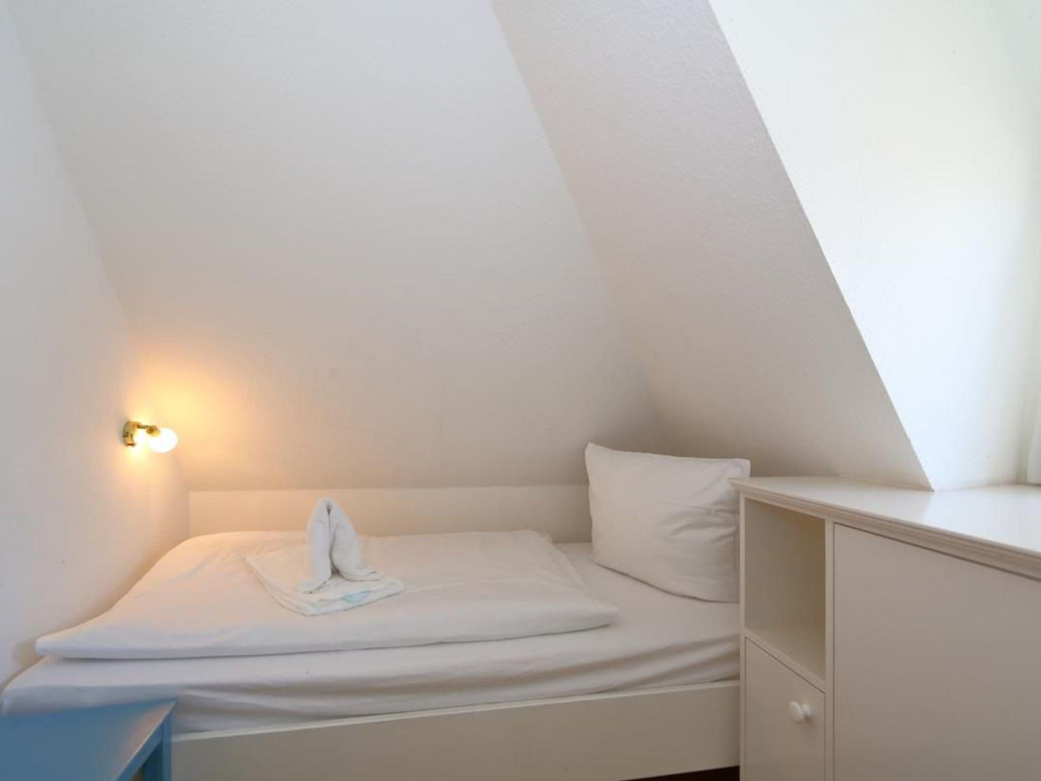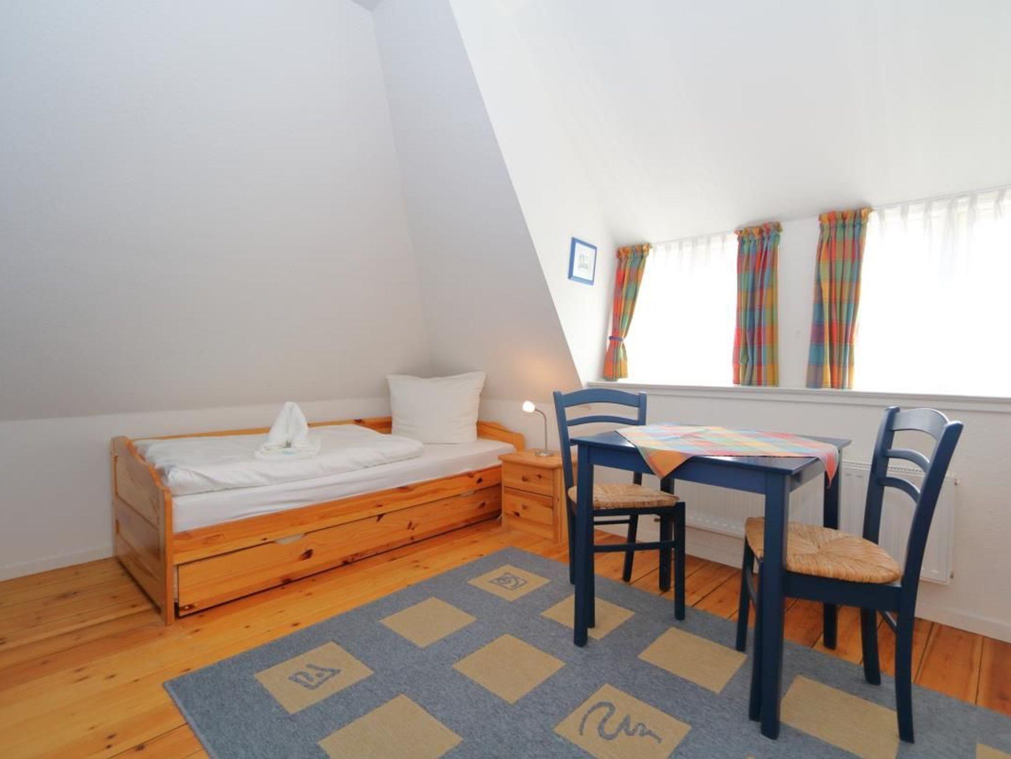 Im Obergeschoss gibt es ein Schlafzimmer mit zwei getrennt stehenden Einzelbetten und ein weiteres kleines Schlafzimmer mit einem Einzelbett. Außerdem ist auf dieser Etage noch ein Bad, nur mit WC und Waschbecken.