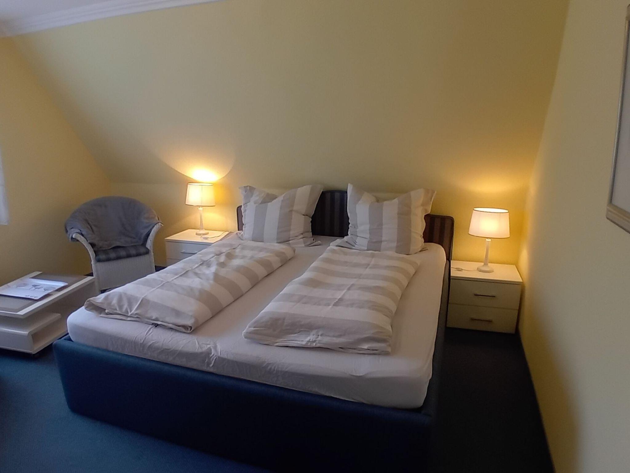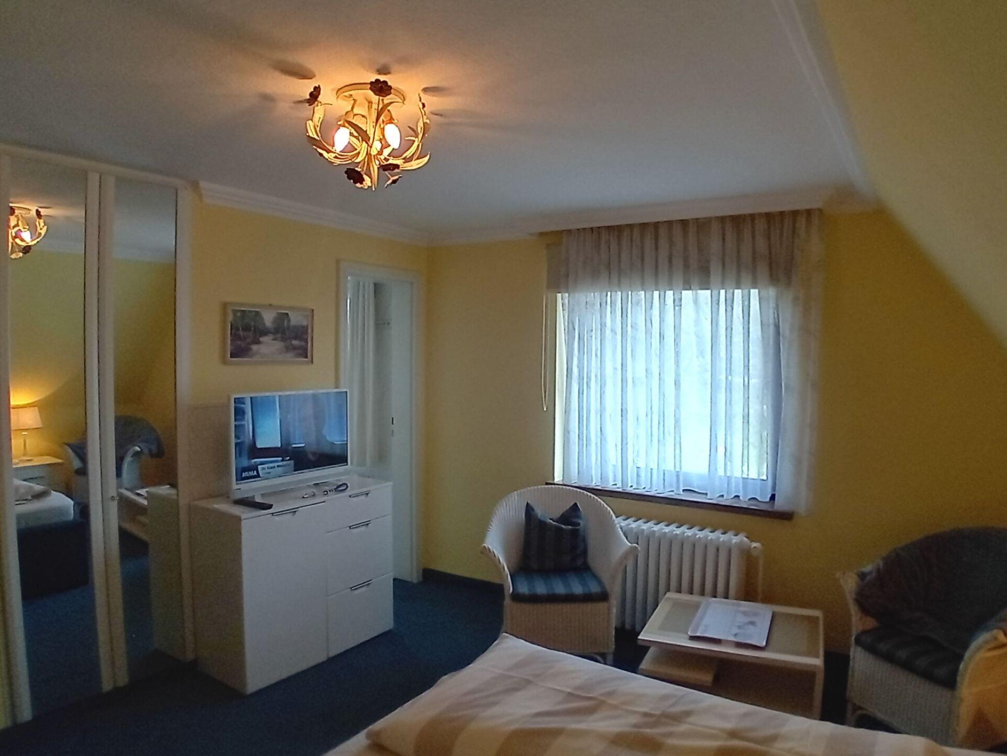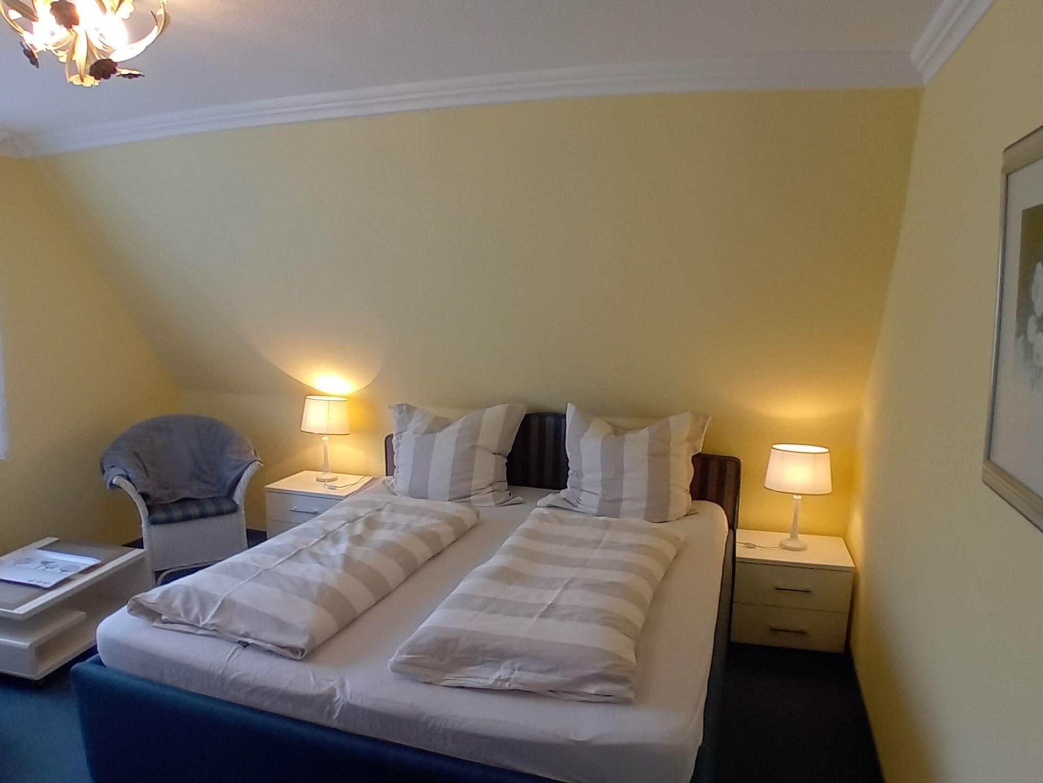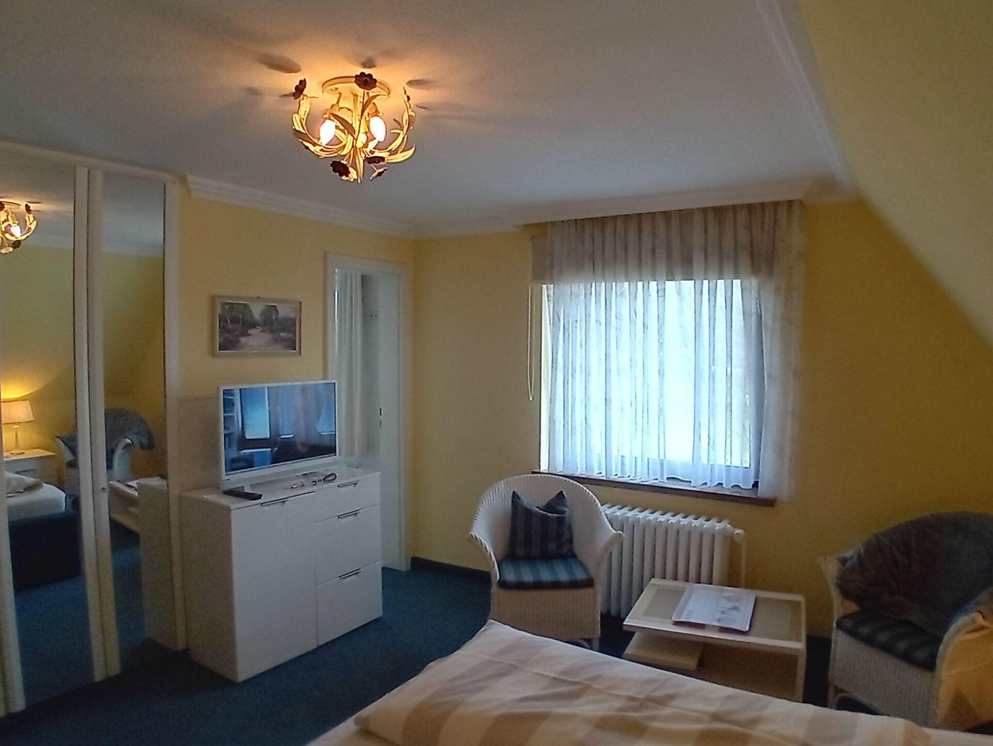 Doppelzimmer in der ersten Etage mit Dusche/WC (modern hell renoviert). Das hochwertige Doppelbett mit offenem Fußende läd zum erholsamen Schlaf ein, Kleiderschrank, Teppichboden, 2 Sessel und Tisch, Flachbild TV sind selbstverständlich. Der wundervollem Ausblick lässt Raum für Träume offen.
