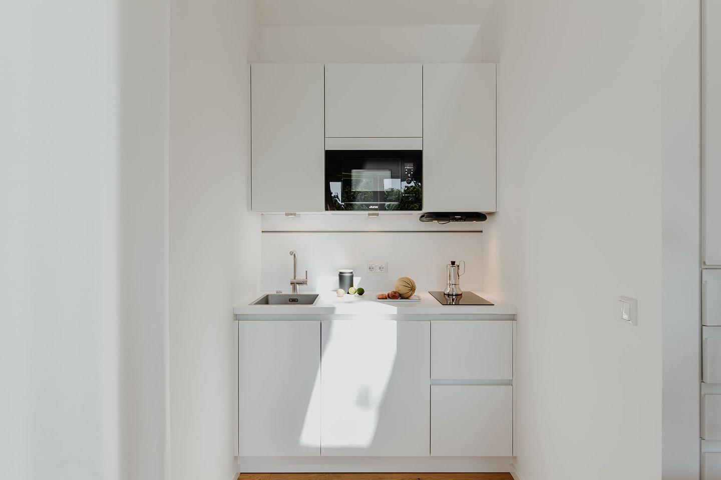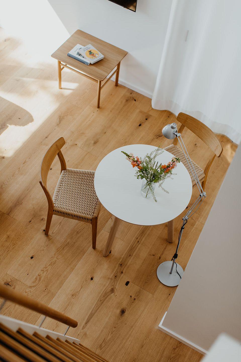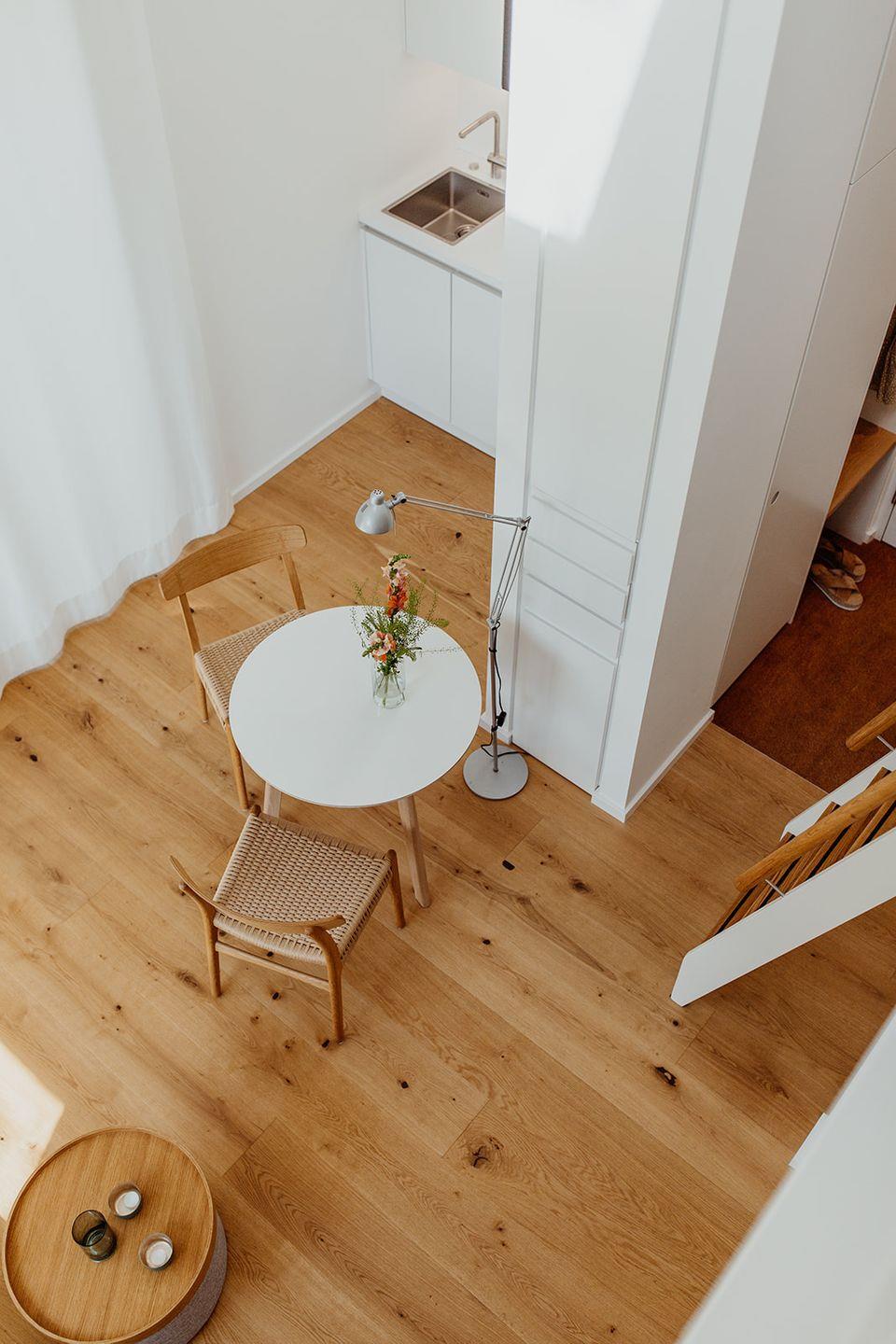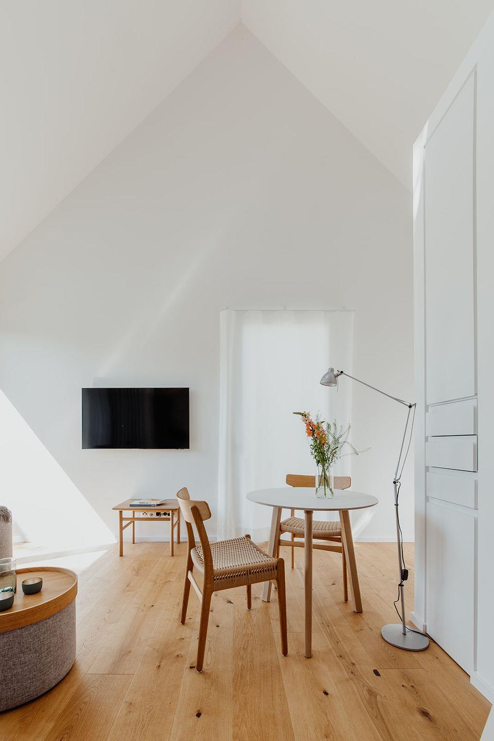 Das Halfhouse ist ein helles, im skandinavischen Stil eingerichtetes Architektenhaus. Es besteht aus einem hellen 30 qm großen Raum mit hohen Decken und Blick in den offenen Giebel. Echtholzdielen und Massivholzmöbel unterstreichen den Stil des Hauses. Neben einer Pantryküche mit 2 Induktionskochplatten, Kühlschrank und Mikrowelle, befinden sich der Aufenthaltsbereich mit Tisch und gepolsterten Stühlen, sowie ein kleines Sofa und der Fernseher.