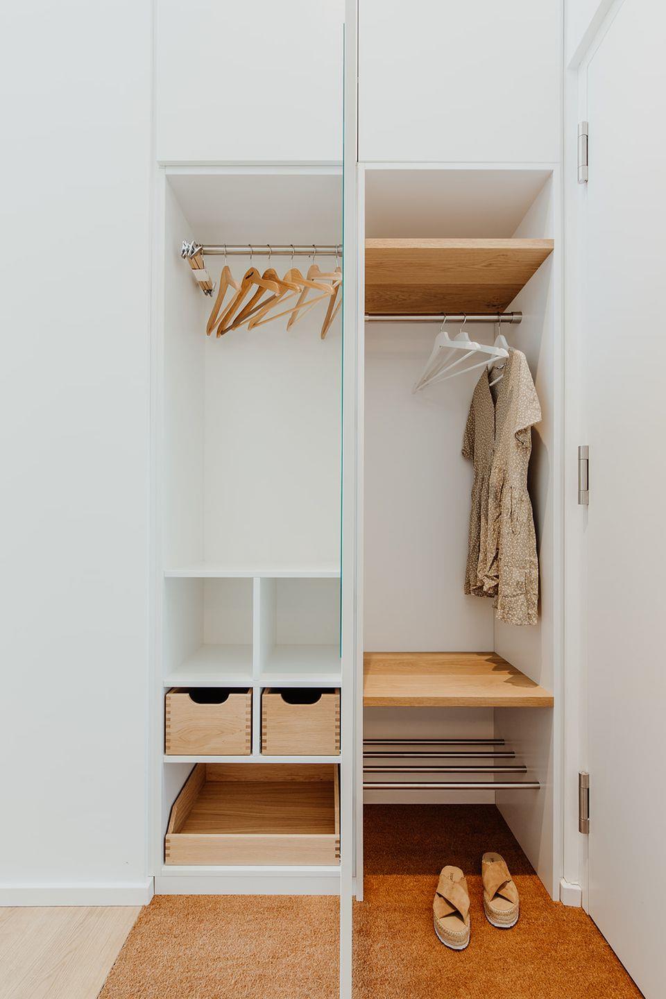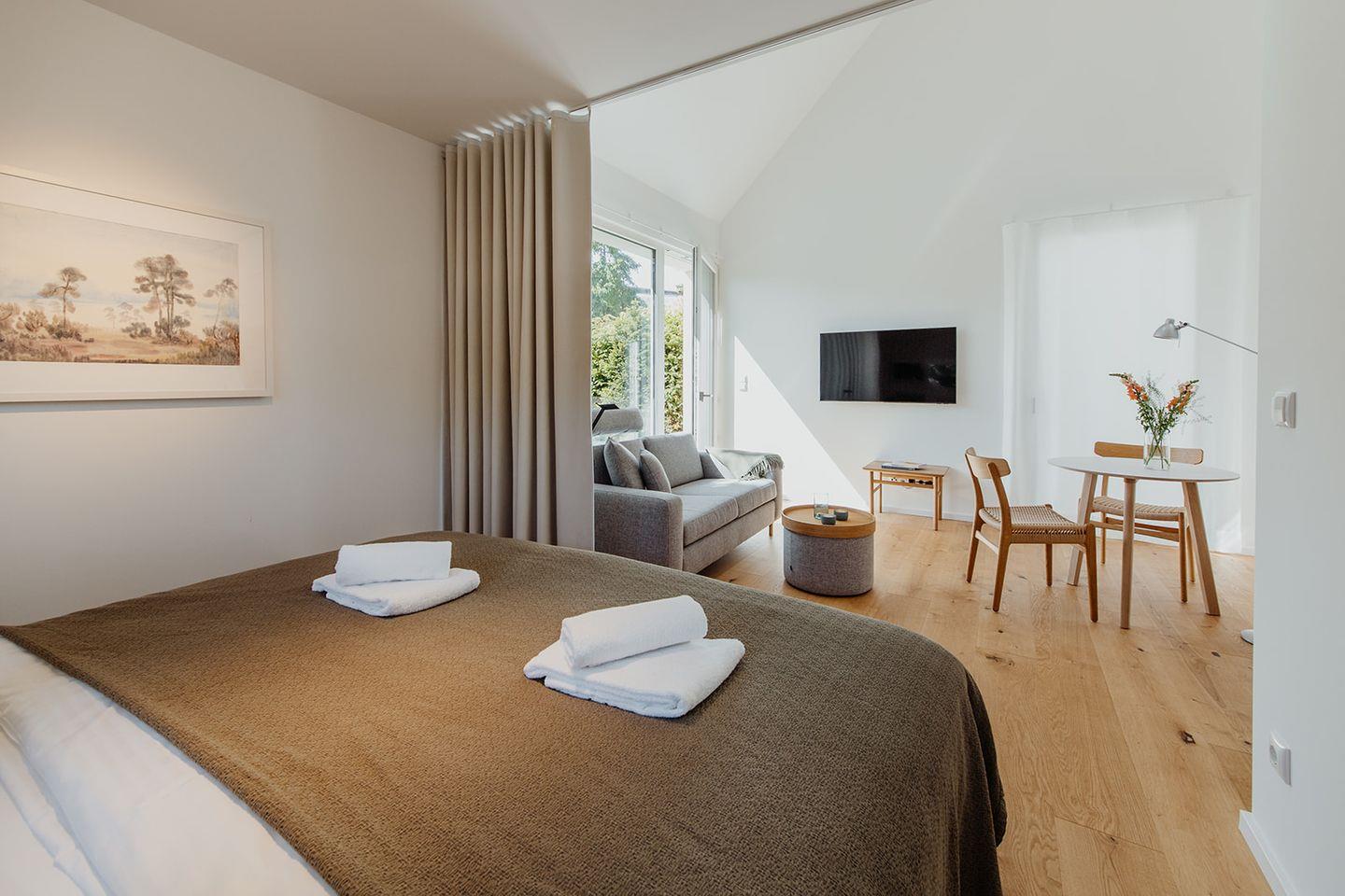 Eine abteilbare Schlafnische ermöglicht den Raum im Raum und lässt sich auch verdunkeln. Das großzügige Bad lädt zum Duschen ein.