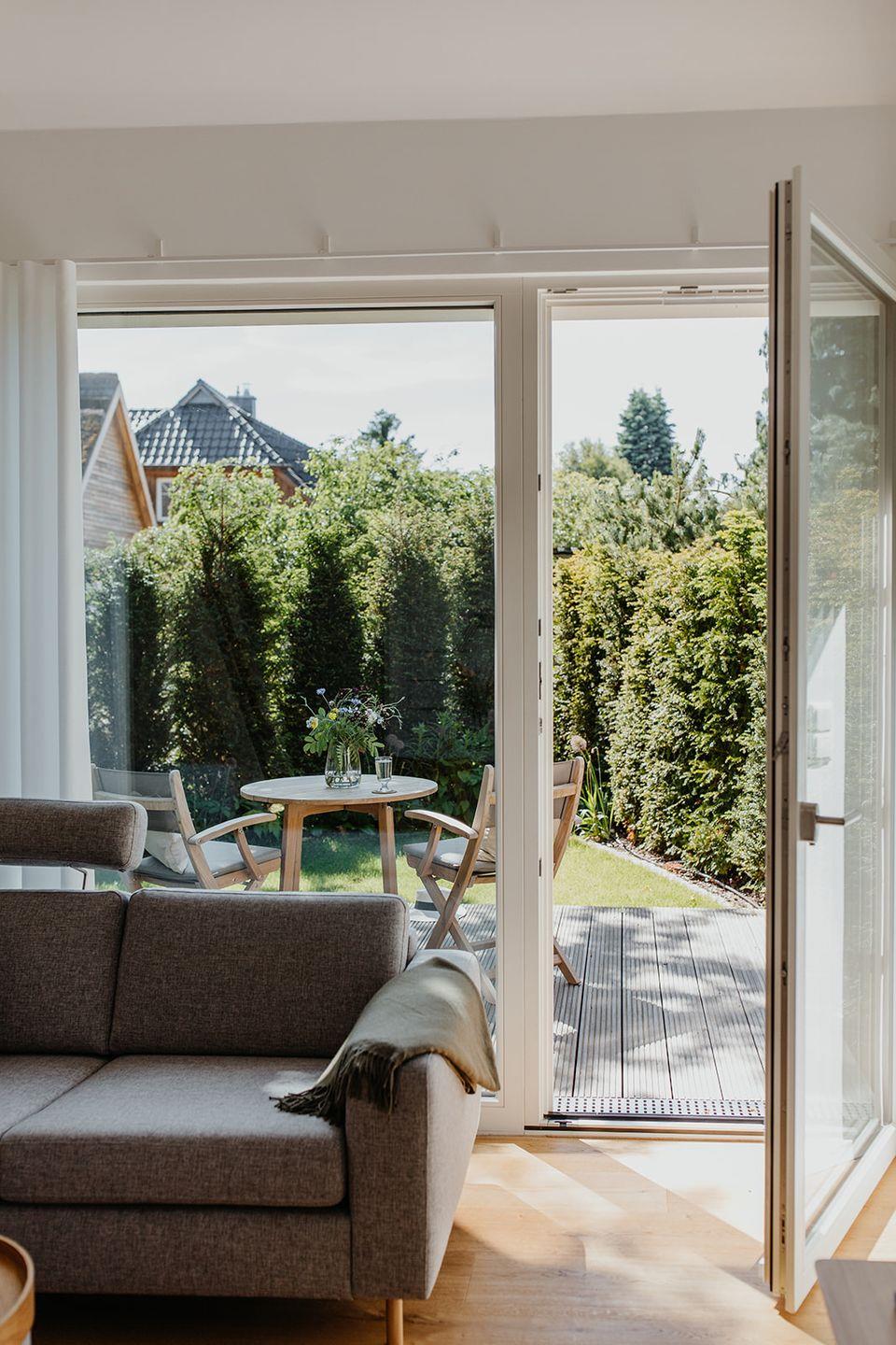 Ein eigener kleiner Garten mit Holzterrasse und Gartenmöblierung lädt nach einem langen Strandtag zum Entspannen ein. Vor dem Haus befindet sich der Parkplatz und die Fahrradständer. In unmittelbarer Nachbarschaft befindet sich auch ein Fahrradverleih.