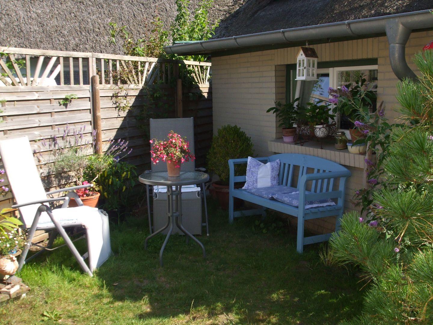Am Ferienhaus laden Gartenmöbel zum Verweilen ein.