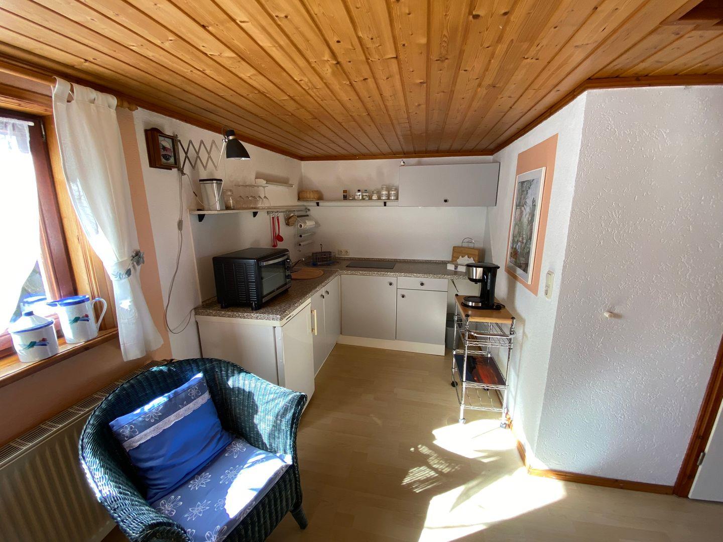 In der Küchenecke finden Sie die Elektrogeräte: Kühlschrank, Kaffeemaschine, Wasserkocher, Toaster, Minibackofen und ein Ceranfeld mit 2 Platten. In den Schränken ist ausreichend Geschirr vorhanden.
