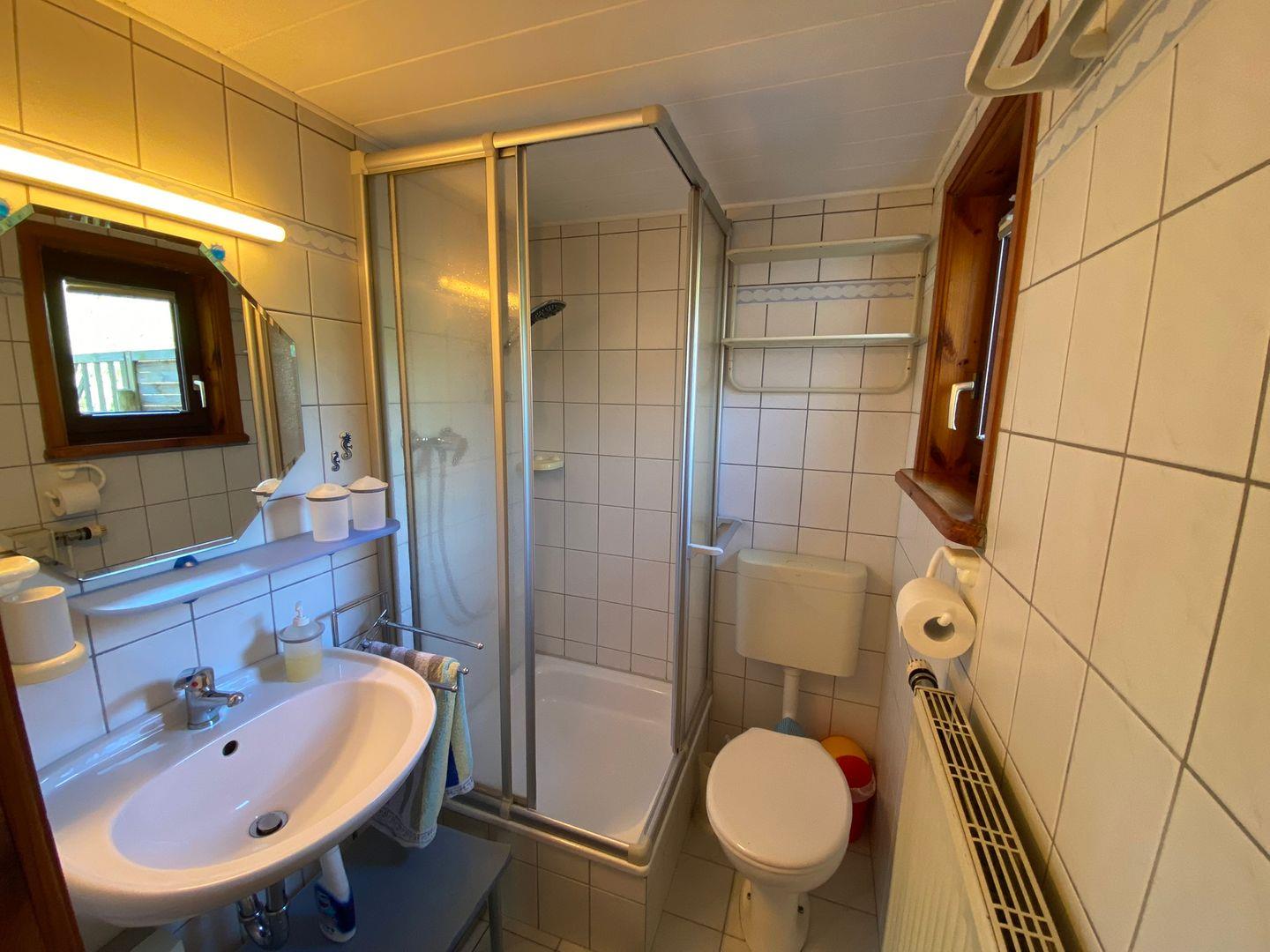 Das Bad ist mit einer Dusche, Waschbecken und Toilette ausgestattet. Hand- und Badetücher liegen im Regal.