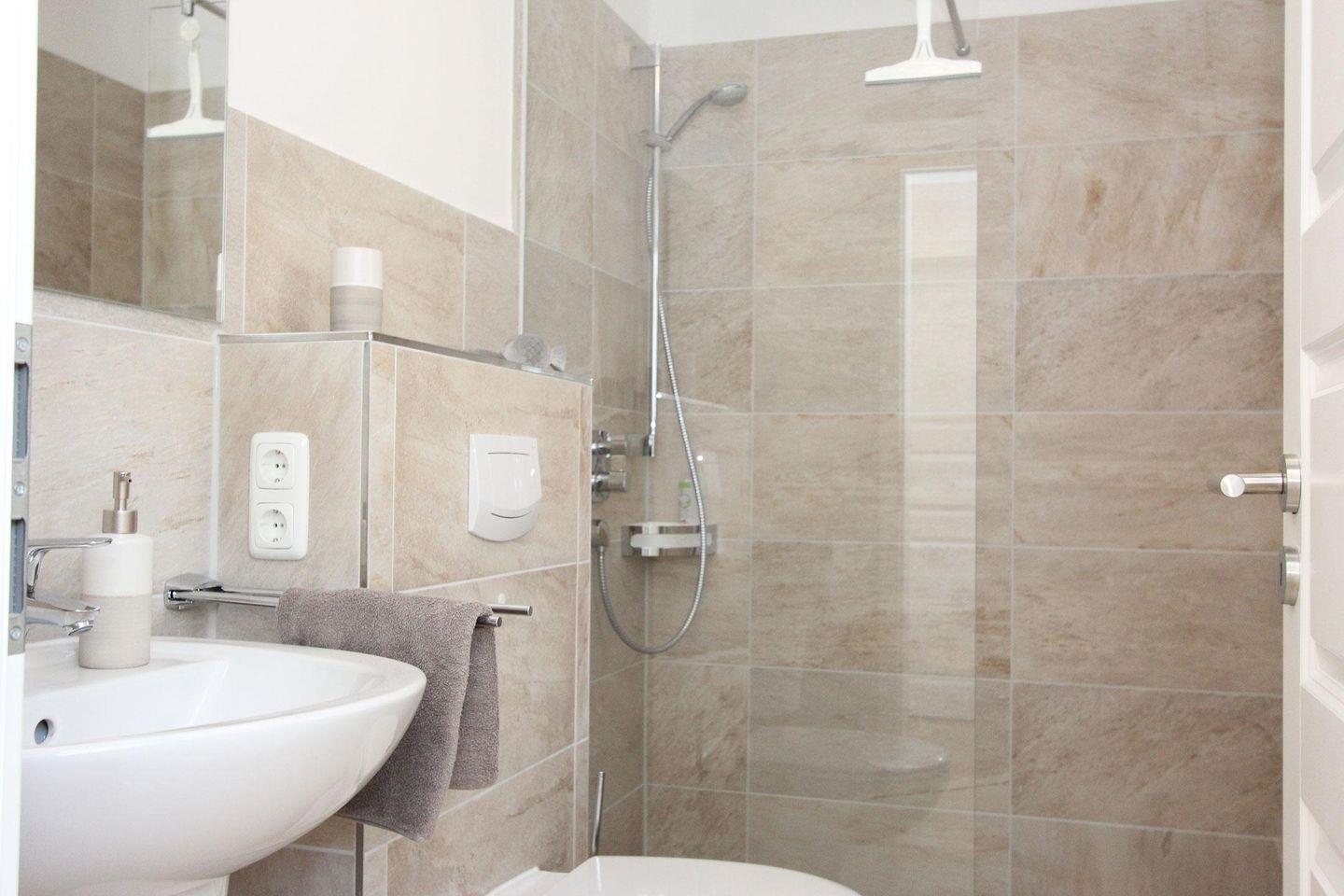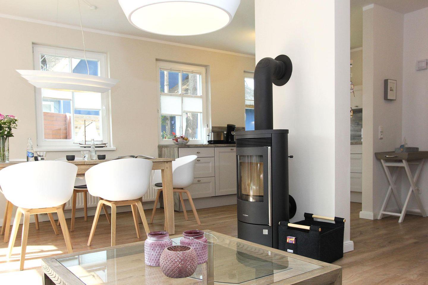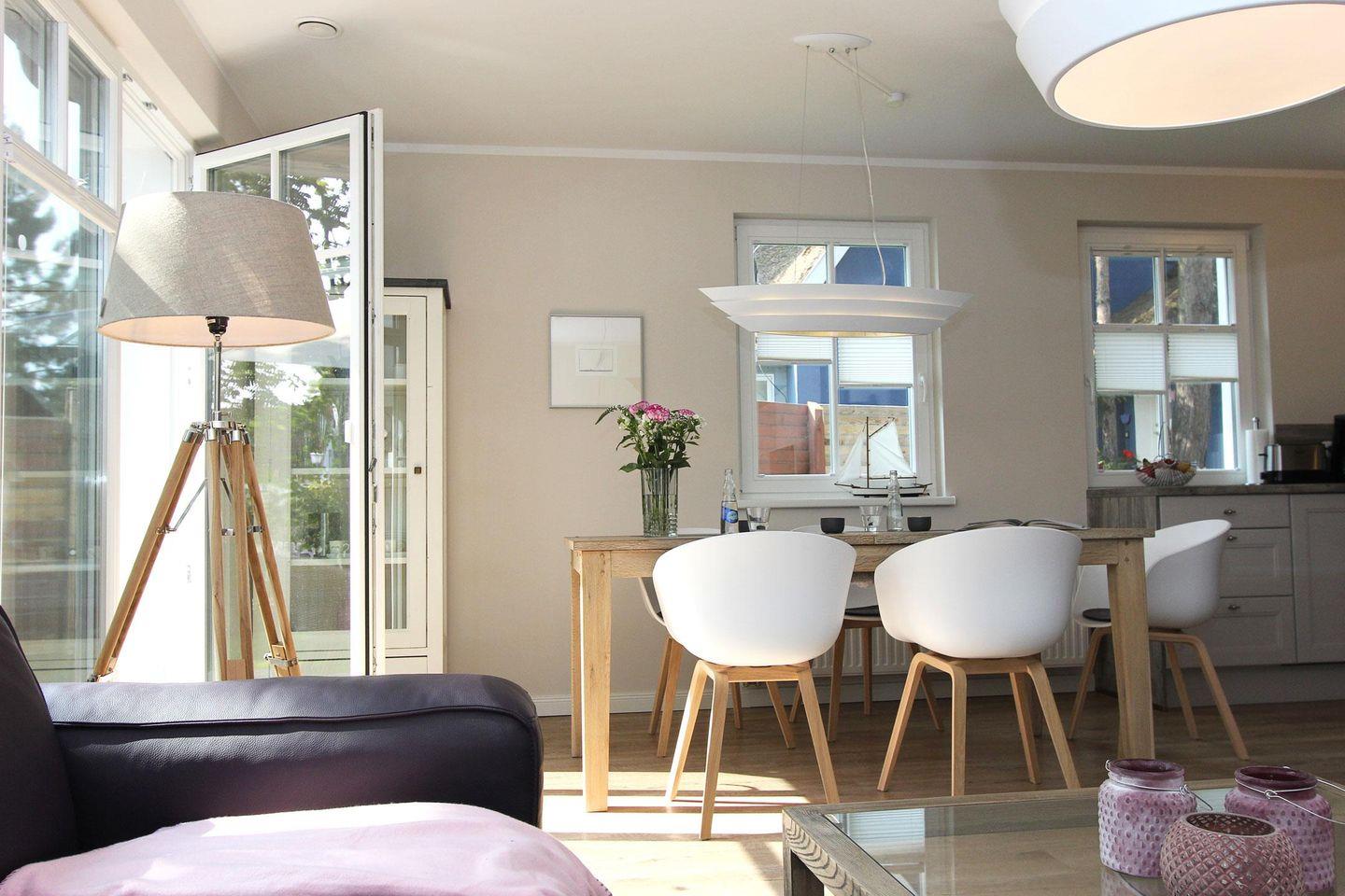 Im Erdgeschoss befindet sich die große geräumige Küche und der lichtdurchflutete Wohn- und Essbereich. Eine Senseo Kaffeemaschine steht in der Küche für Sie bereit. Vom Wohnzimmer aus gelangen Sie direkt auf die Südterrasse und in den beschaulichen, grünen Garten. Ebenfalls im Erdgeschoss finden Sie das Gästebad mit einer bodengleichen Dusche.