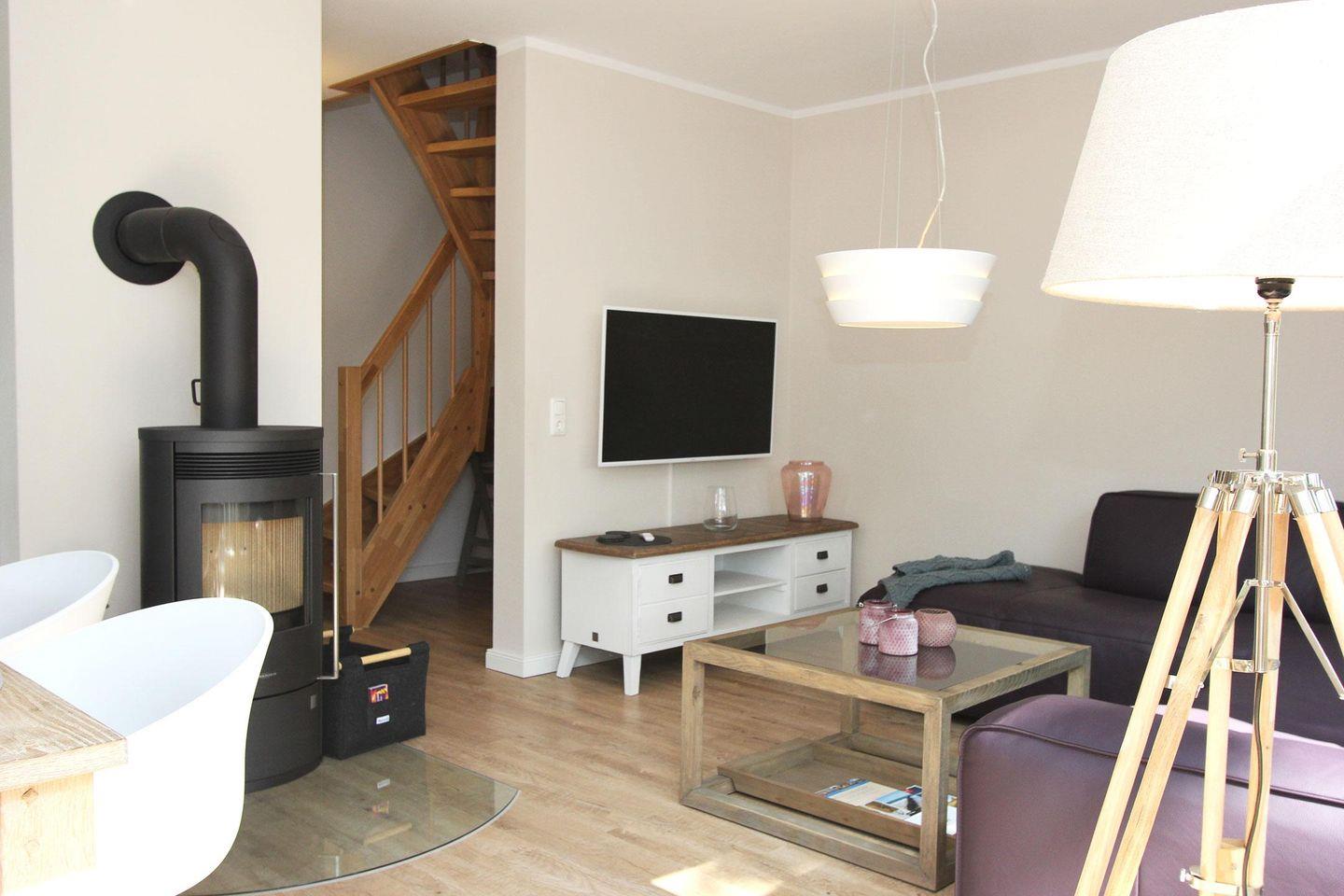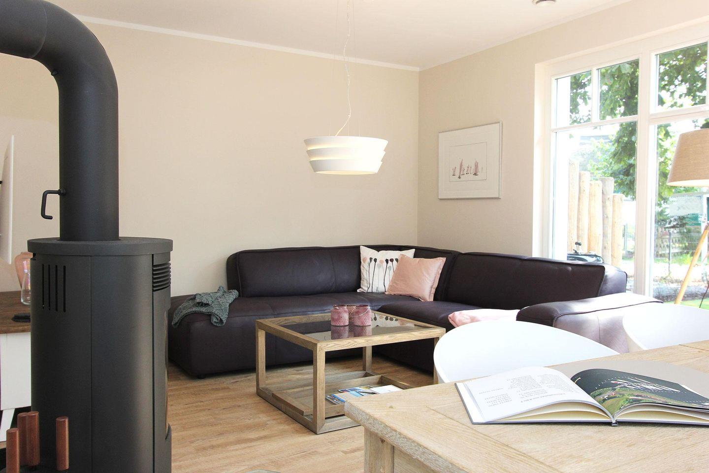 In der kalten Jahreszeit lassen sich gemütliche Stunden vor dem Kamin im Wohnzimmer verbringen.