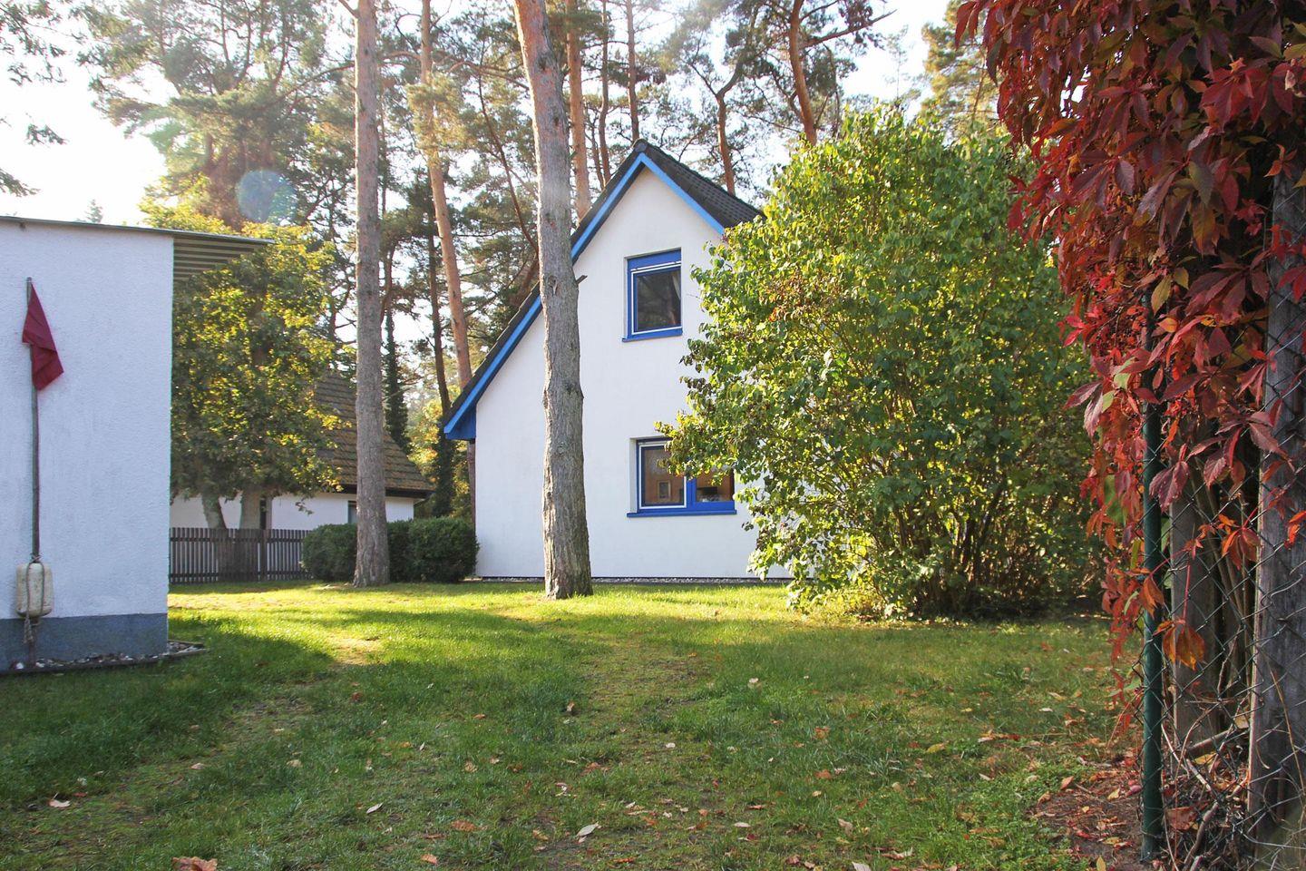 Im Bereich vor der Haustür befindet sich eine Terrasse, auf der Bank und ausziehbarer Tisch stehen (weitere 4 Stühle sind vorhanden). Der Garten führt rings um das Haus und ist von allen Seiten eingezäunt.