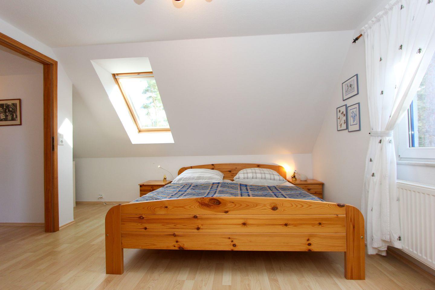 Über eine (schmalere) Treppe im Flur gelangt man in die obere Etage, in der sich zwei Schlafzimmer mit jeweils einem Doppelbett (1,80 x 2,00 m) sowie ein Badezimmer mit Dusche und WC befinden. Es besteht hier die Möglichkeit zum Aufbau eines Kleinkinderbettes.