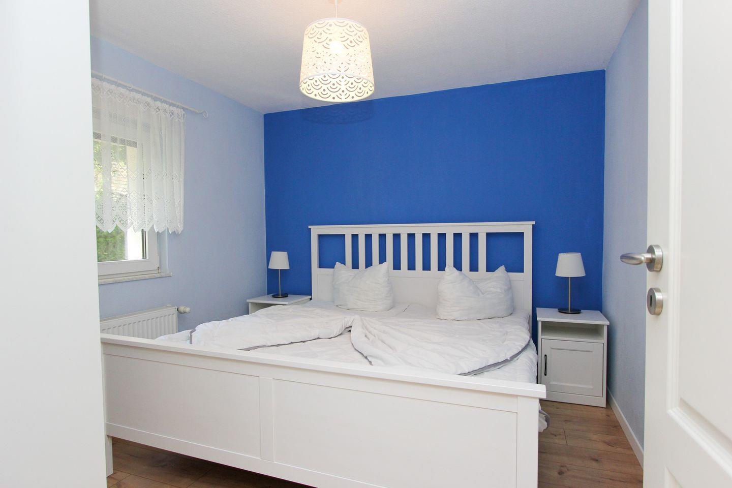 Ebenfalls im Erdgeschoss befinden sich zwei Schlafzimmer mit einem Doppelbett und zwei Einzelbetten. Ein Abstellraum und ein Badezimmer mit Dusche, WC und Waschmaschine sind auch im unteren Bereich des Hauses zu finden.