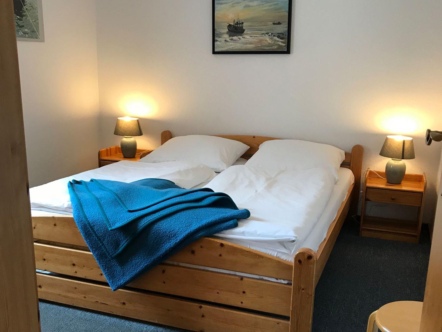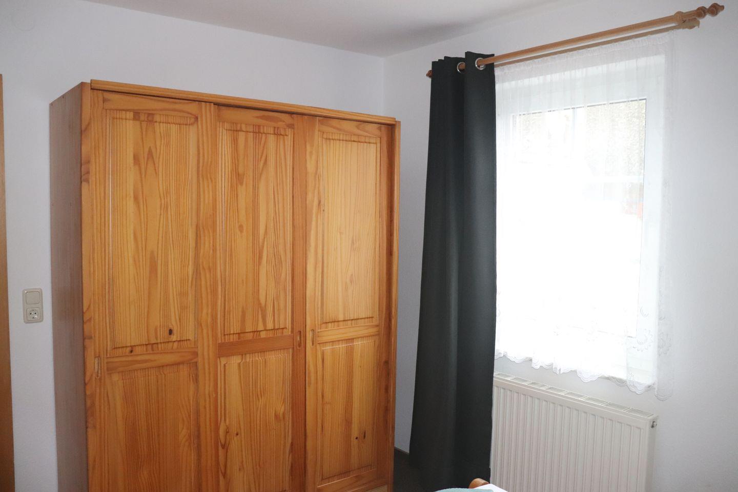 Schlafzimmer mit Ehebett und großem Kleiderschrank.