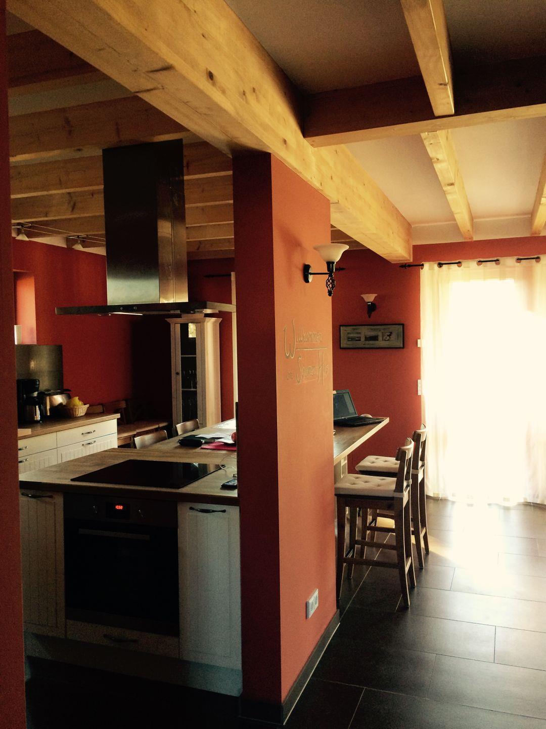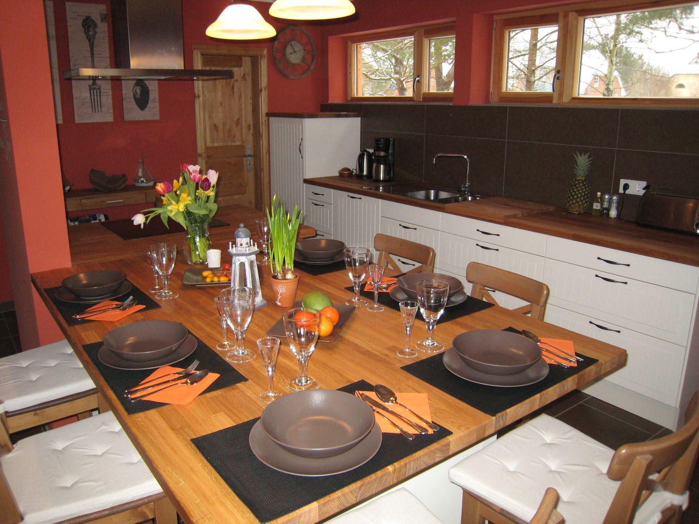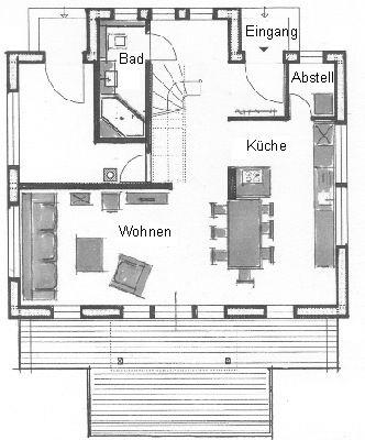 Im Erdgeschoss befindet sich der offene Wohn-, Küchen- und Essbereich mit Kaminofen, Sat-TV, Radio und CD-Player. Den Mittelpunkt bildet der große Esstisch mit integriertem Herd, der für 8 Personen Platz bietet und zum gemütlichen Verweilen einlädt. Die Küche ist voll ausgestattet (Kühlschrank, vollintegrierter Geschirrspüler, Induktionsherd mit Backofen und Insel-Dunstabzugshaube). Im angrenzenden Abstellraum befindet sich eine Waschmaschine. Das Bad im EG ist mit Badewanne, Waschtisch und WC ausgestattet.